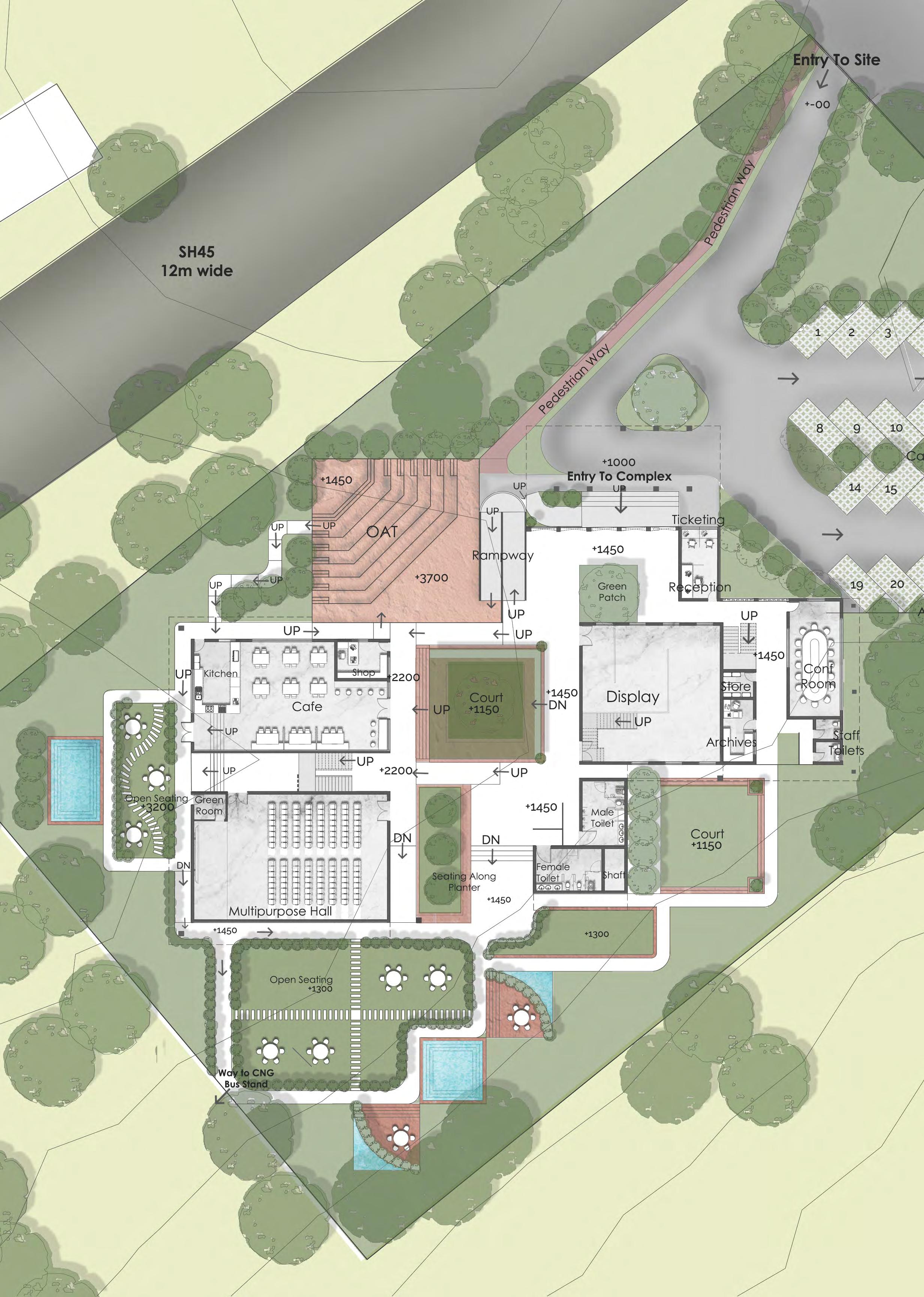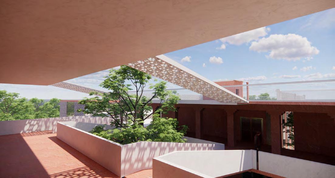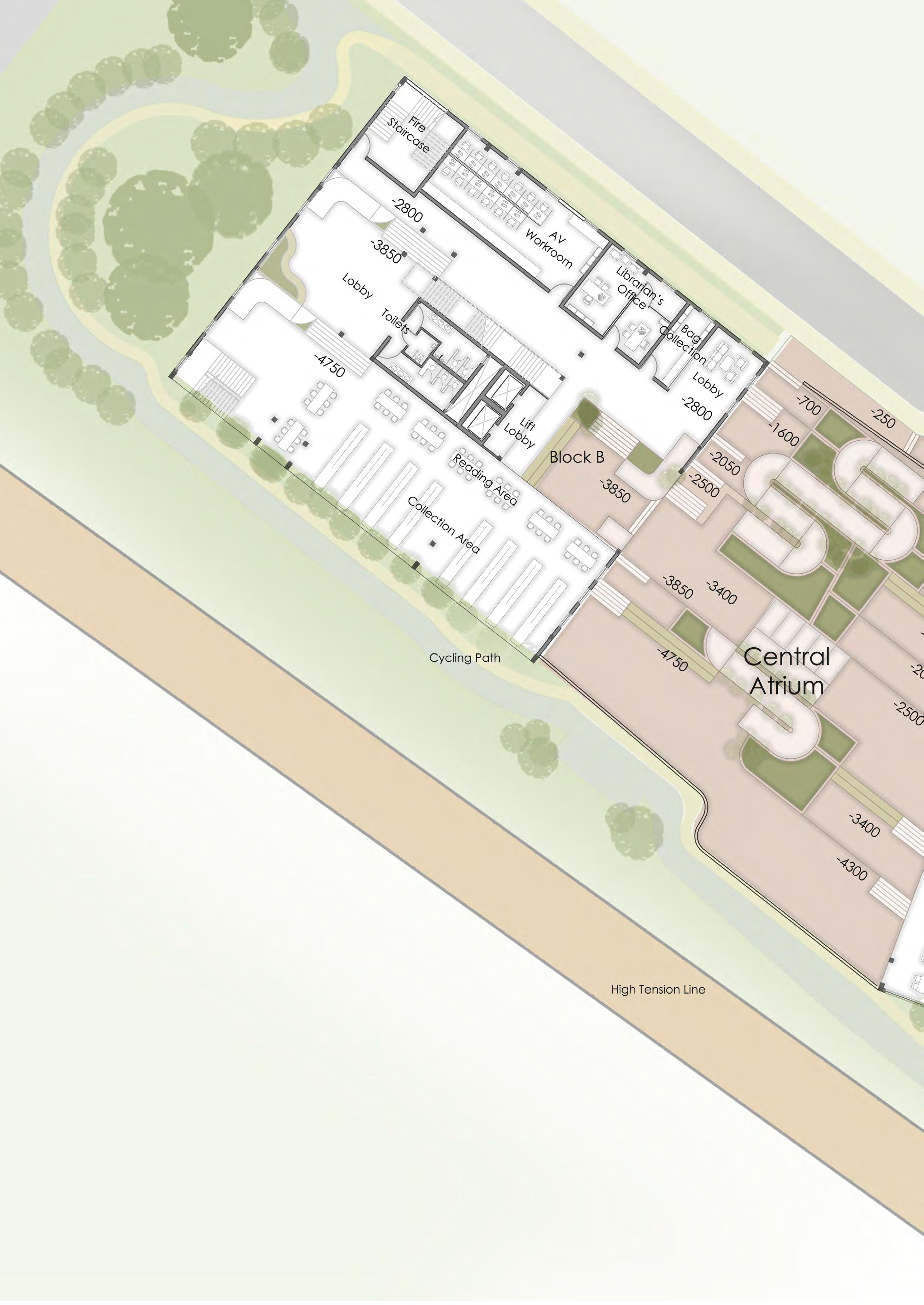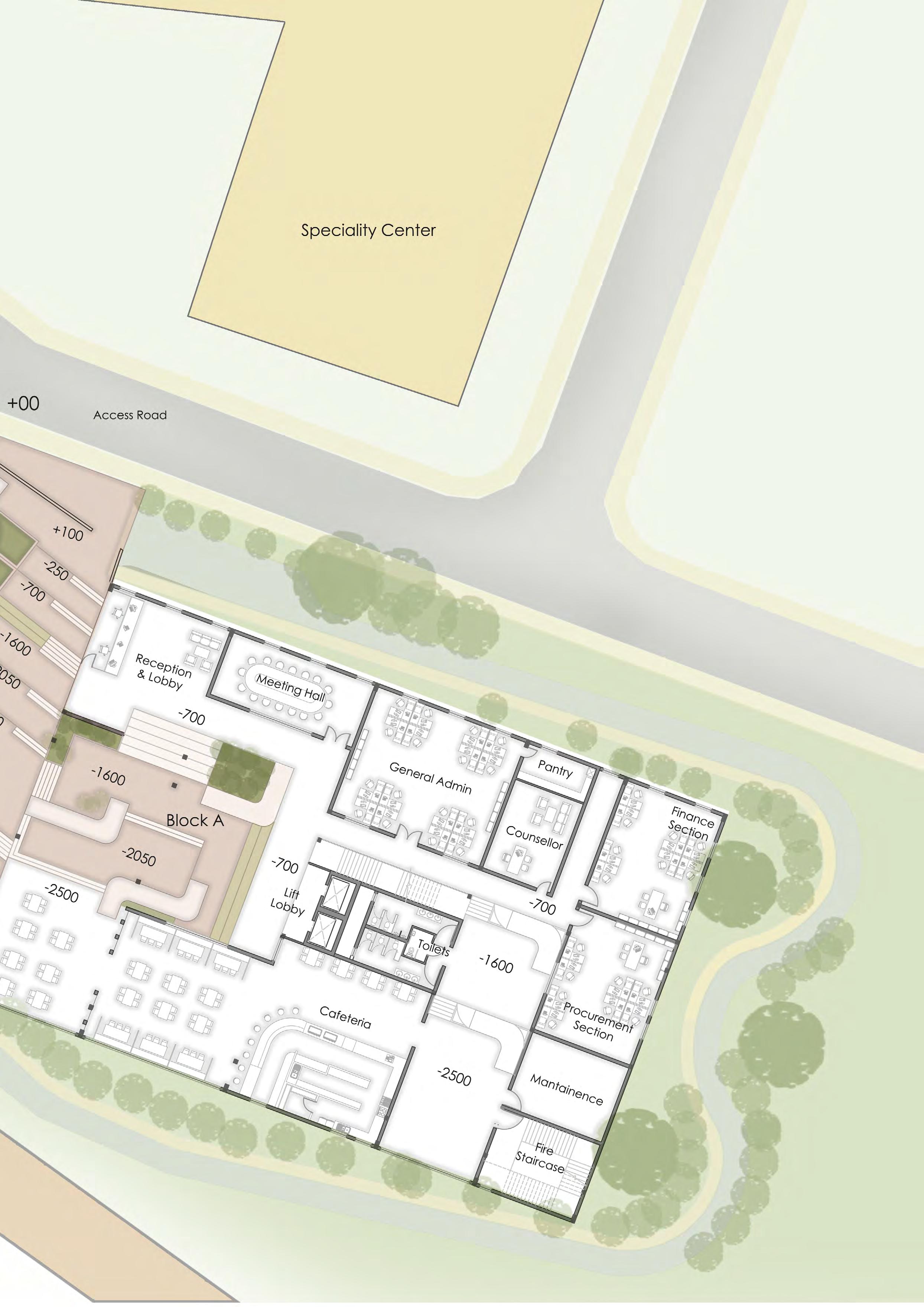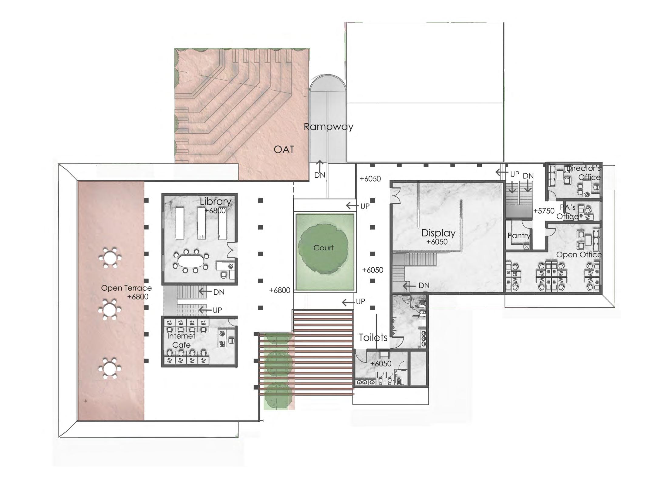 Both the floors are connected via a ramp for easy accessibilty, the ramp also connects the OAT midlevel making it an interesting path to be taken. The central court acts as a connecting feature of both levels visually as well as aesthetically. Further more on the ground level multiple landscaped areas have been created for seating, cafeteria space and spillout areas for employees as well. Landscaped areas feature water bodies which make the spaces more serene and grand together. On the first floor, the library and internet cafe flow out into the open terrace facing the beautiful landscape below.