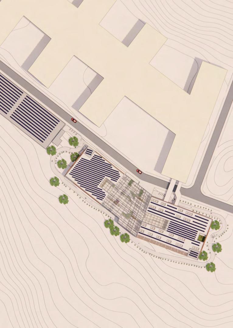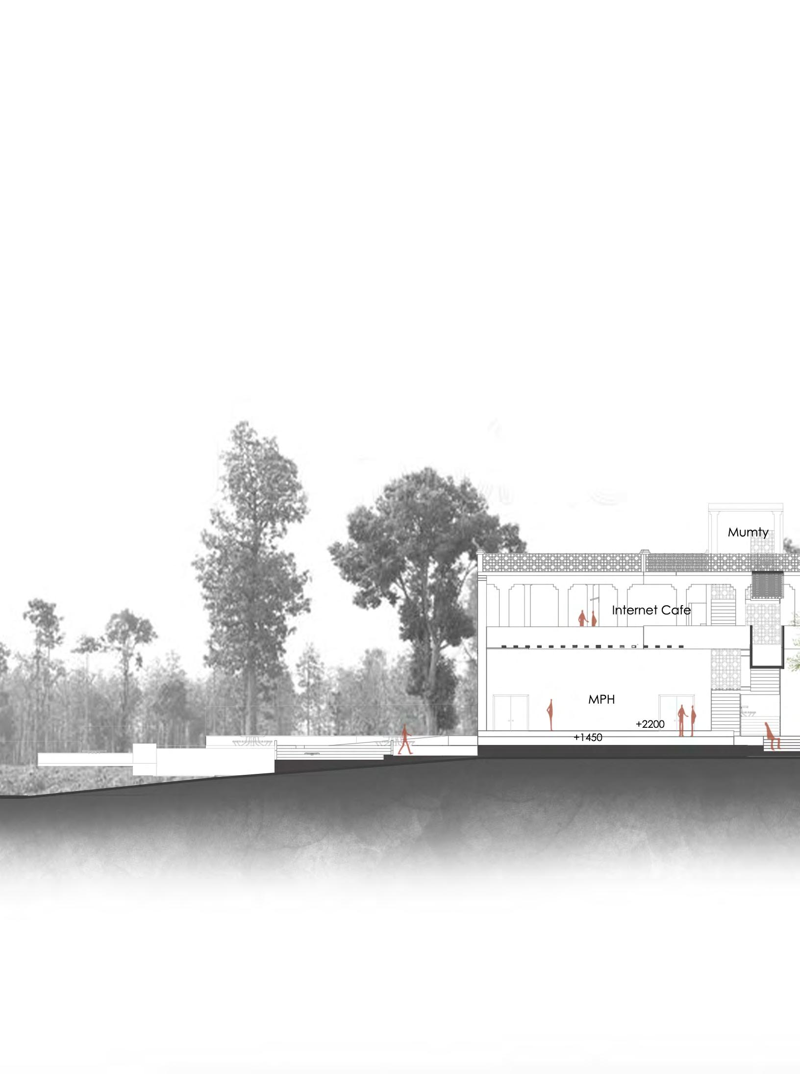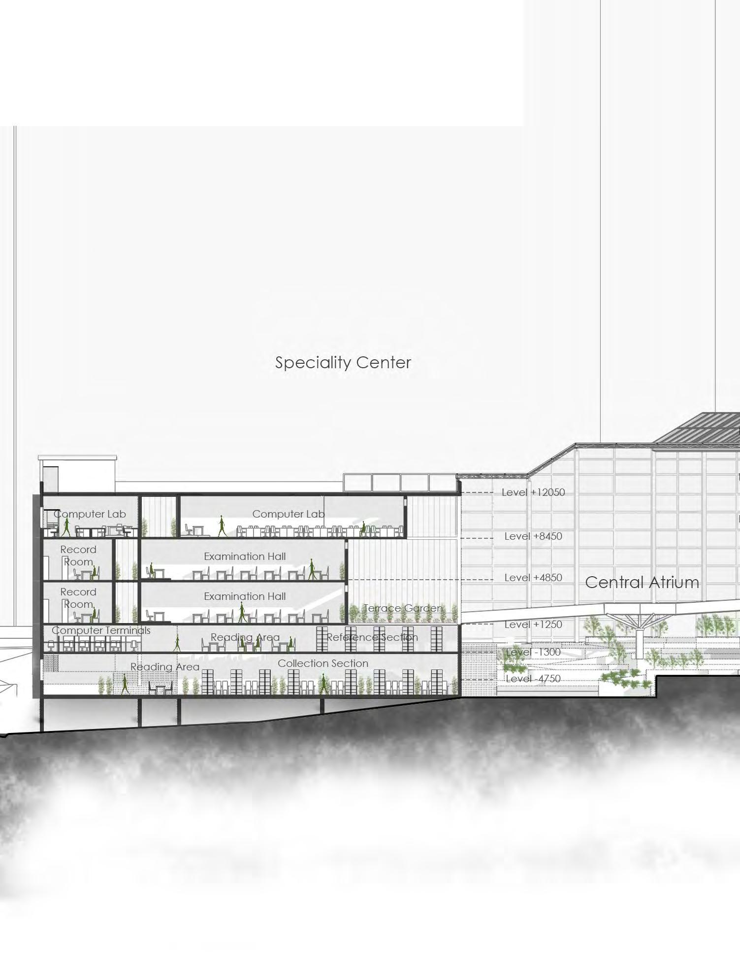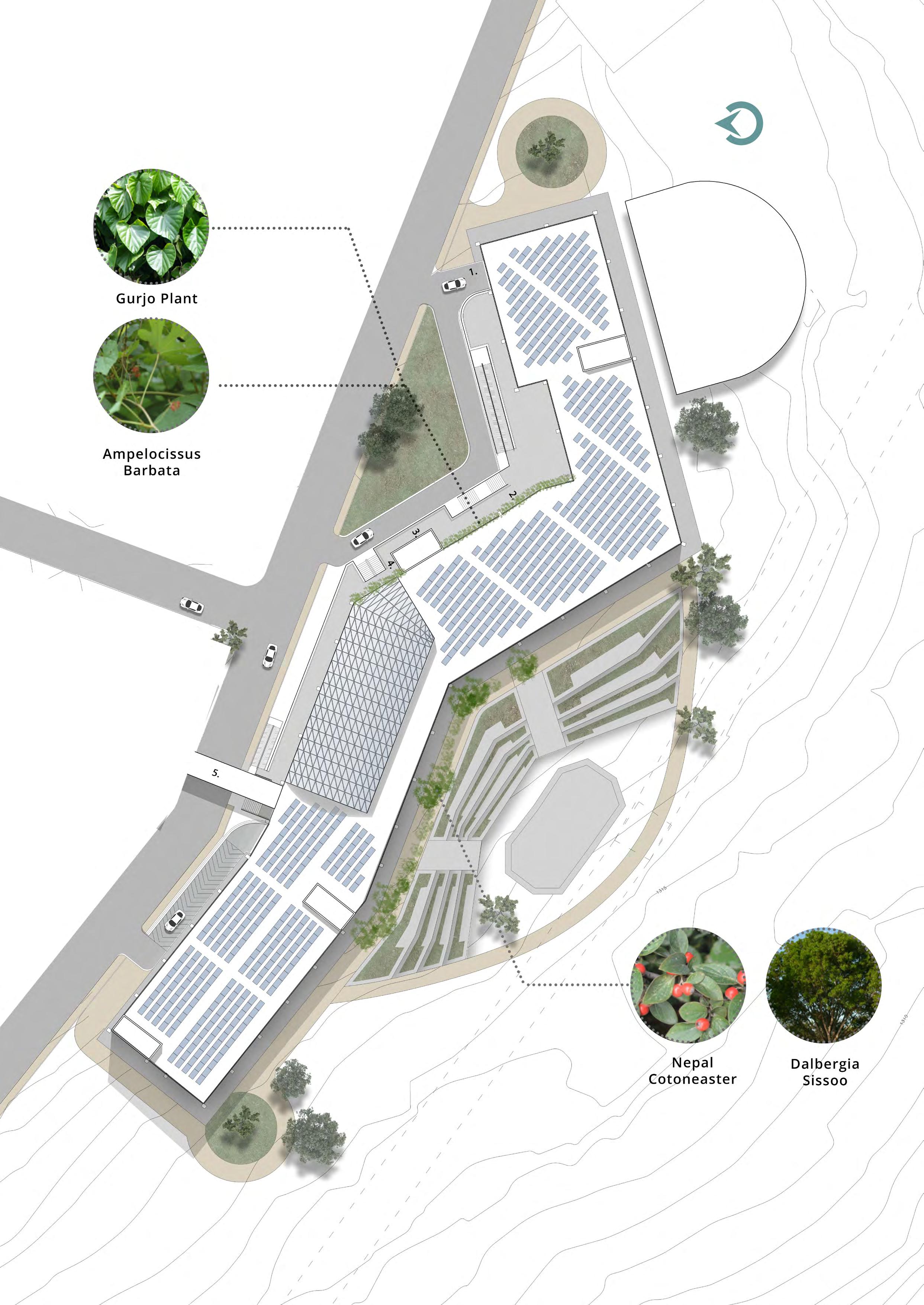 Both the floors are connected via a ramp for easy accessibilty, the ramp also connects the OAT midlevel making it an interesting path to be taken. The central court acts as a connecting feature of both levels visually as well as aesthetically. Further more on the ground level multiple landscaped areas have been created for seating, cafeteria space and spillout areas for employees as well. Landscaped areas feature water bodies which make the spaces more serene and grand together. On the first floor, the library and internet cafe flow out into the open terrace facing the beautiful landscape below.