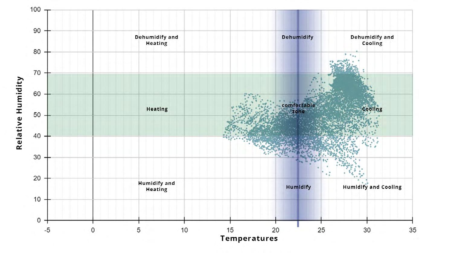 The climate is influenced by two factors i.e the humidity and the dry bulb temperature.To establish the comfort band, if the relative humidity falls either below 30% or above 70% it is deemed as uncomfortable. The same was done with temperature which defined the upper limit of comfort and the lower limit of comfort for each month.