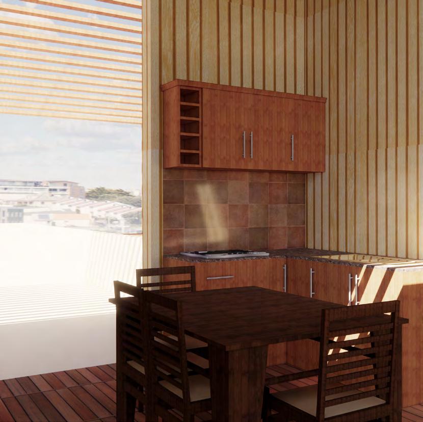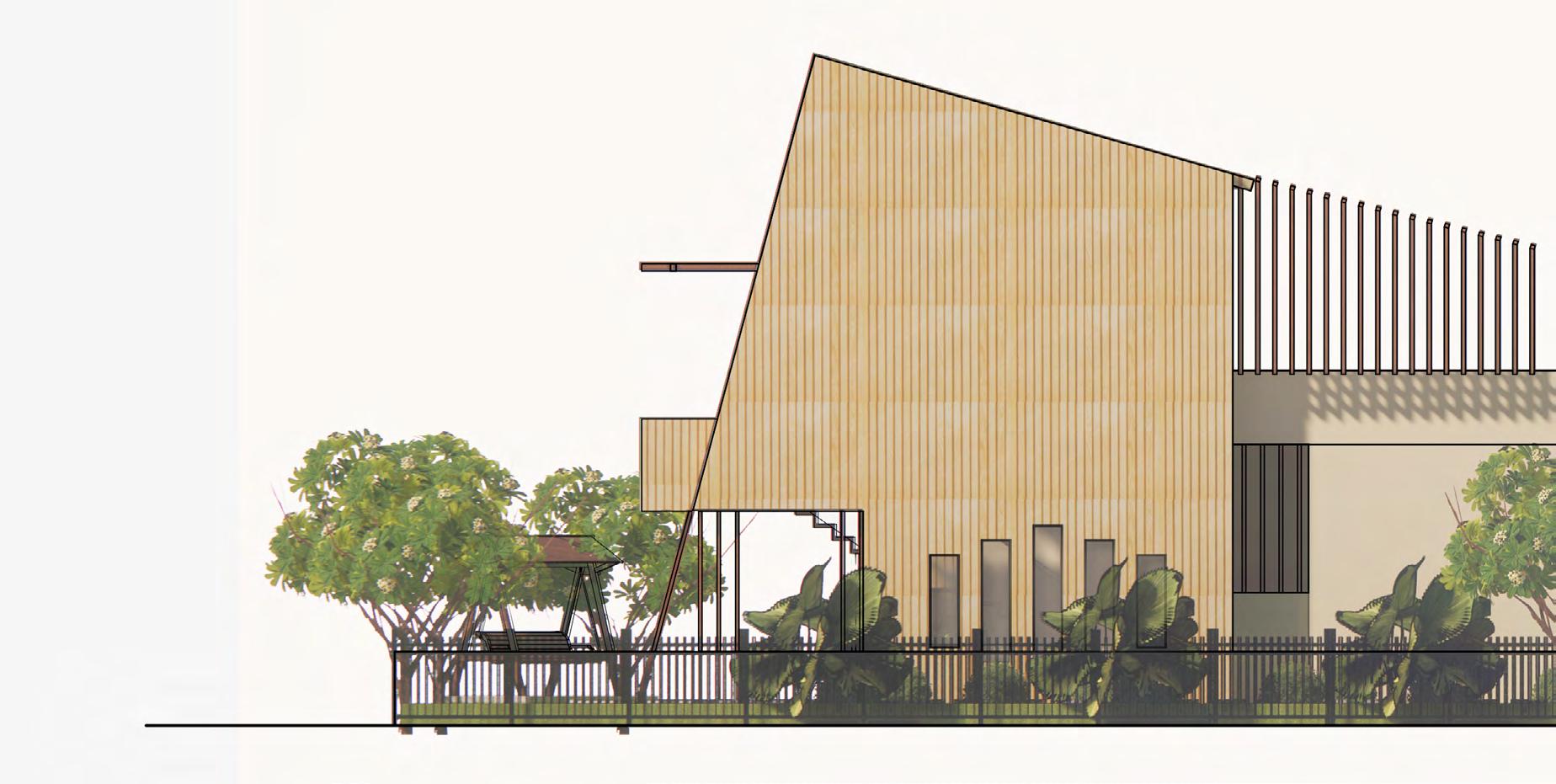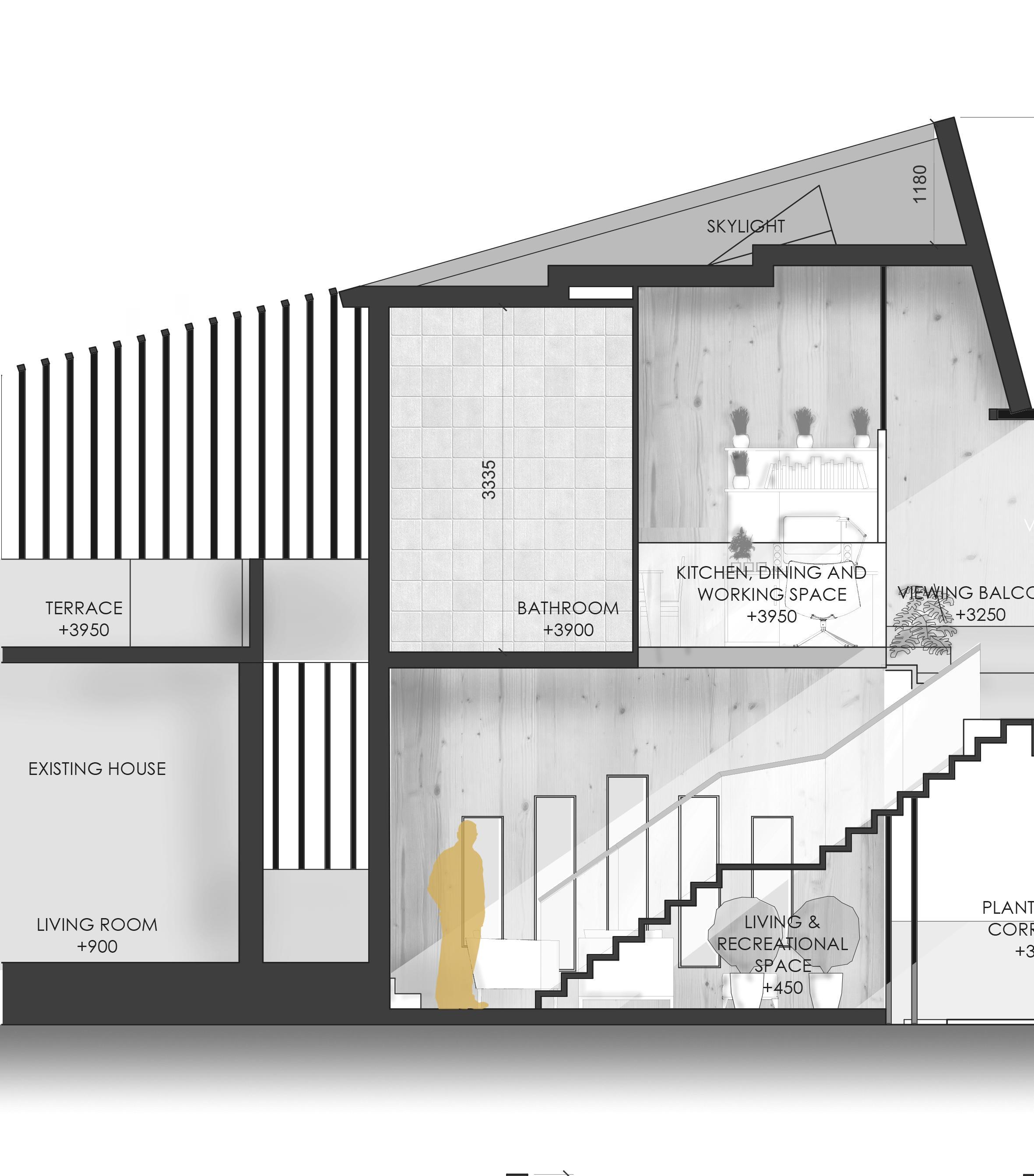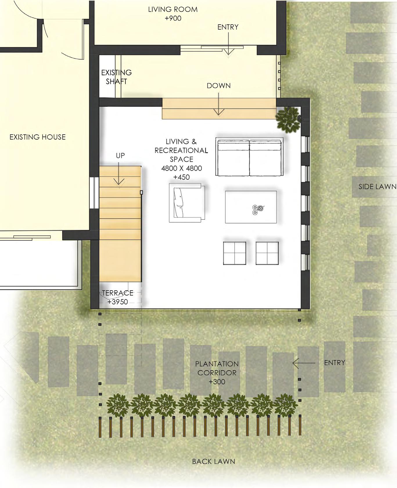 Divided into two levels, one level is an extensiob to teh existing living room and open out into the backyard and the other is a simple kichentte and working space. It provided many semi-open spaces for the family to interact in and have a lesiure time.