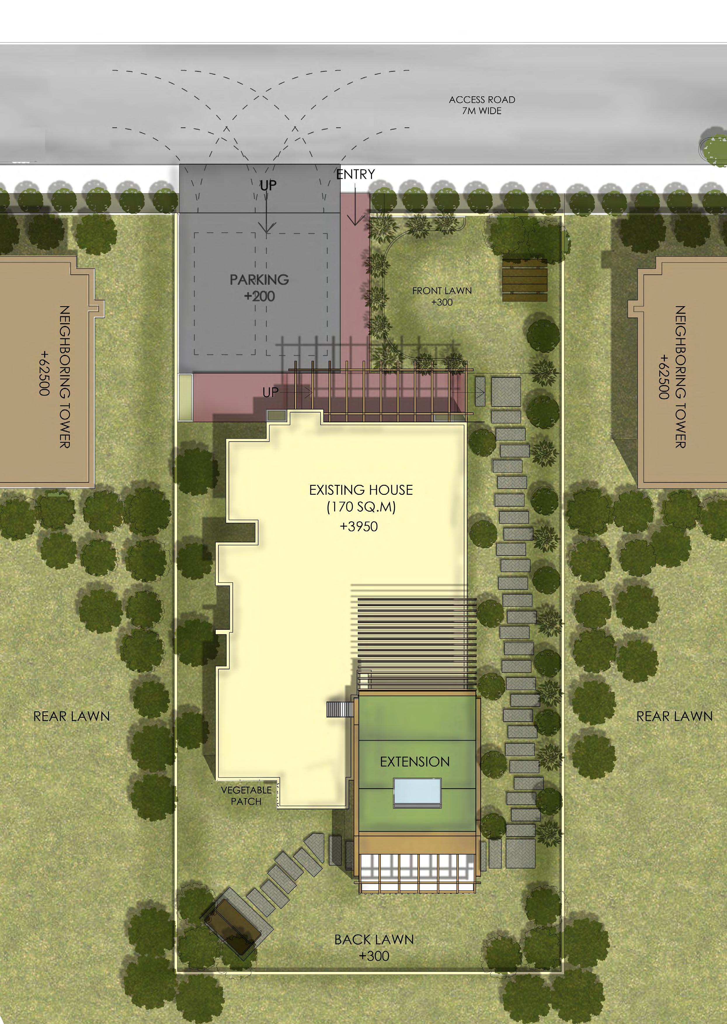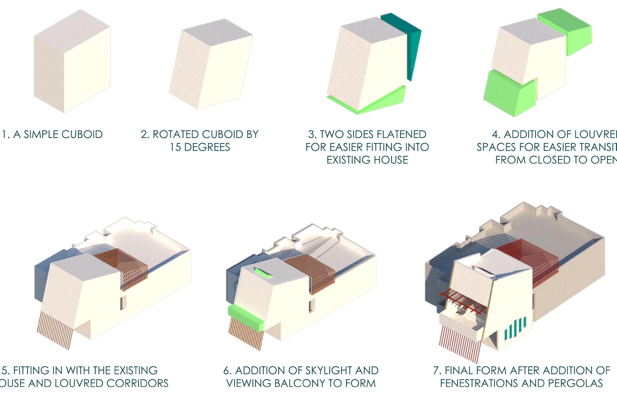 1. Simple Cuboid 5. Placing in with the existing house 6. Addition of Skylight and Balcony space 7. Final Form after addition of fenestrations and pergolas