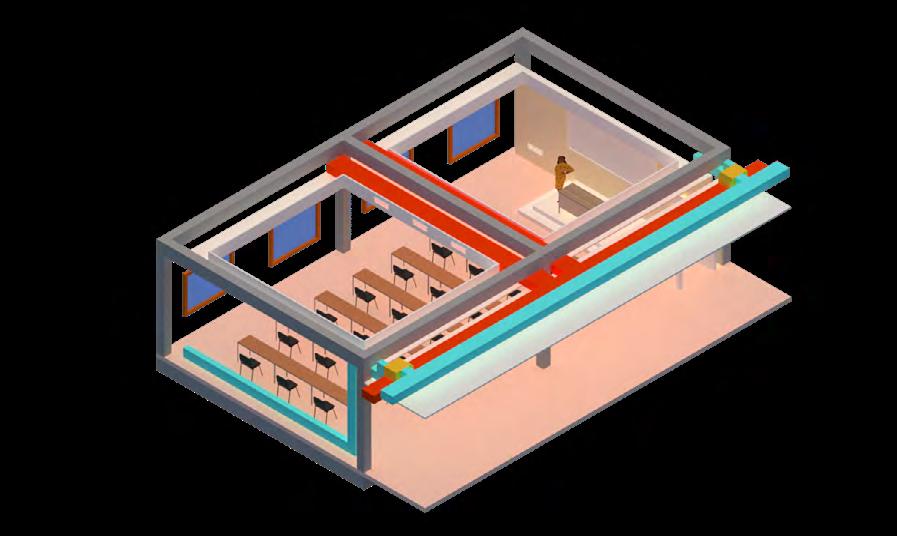 The system has been laid out in a way to provide suitable air pressure, velocity and temperatures in the spaces. For the same, the fresh air supply ducts have been placed in the lower end of the walls and the exhausts have been placed on the ceiling level. Furthermore, media filters have been placed in the ducts as they are good for filtering out bacteria and fungus as well as the remaining fine particulate