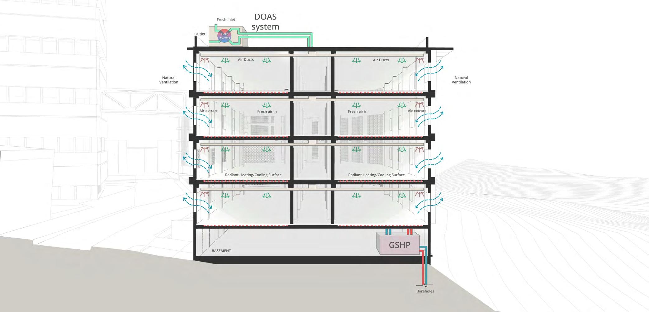 The proposed system for our institutional building is a combination of a Ground Source Heat Pump along with a Dedicated Outdoor Air System. While the ground source heat pump takes care of the latent heat load, the DOAS takes care of the sensible heat load. Two systems have been deployed for the institute, where they work parallelly