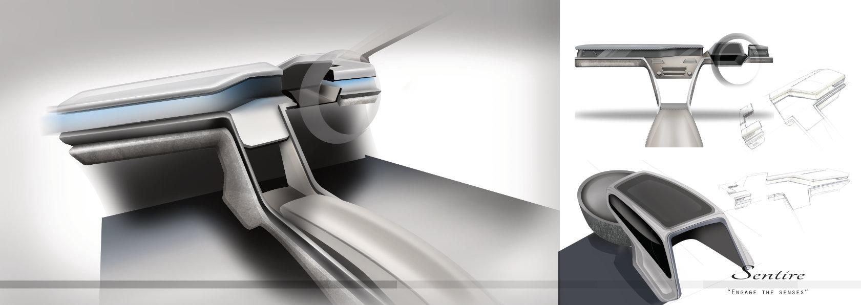 A vehicle interior delivering a sensory experience for users focusing on the senses of smell, touch and sight. Through the use of bespoke fragrances, contemporary textures and LED ambient lighting the interior will transform into an environment unique to each individual creating a space that develops an emotional bond with the user. The interior will incorporate textures and materials not traditionally found in cars resulting in a setting that encourages both exploration and interaction. “An experience not to be forgotten”