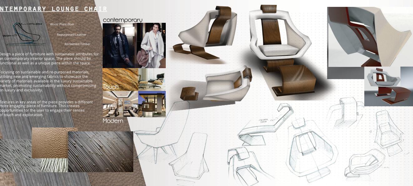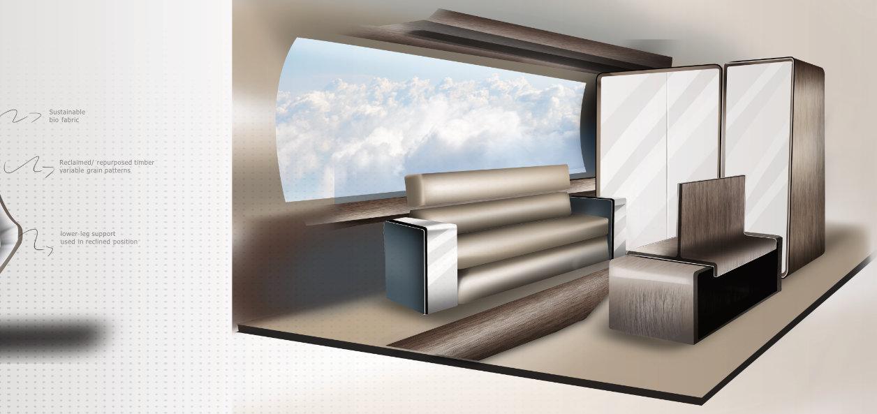 The concept was developed to promote sustainability within the frame work of a high-end luxury private jet. The goal was to not only revitalise the interior cabin of a mid range executive jet but to also introduce new materials, bring sustainability to the fore front of design.