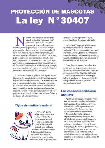 El maltrato animal es penado y castigado por el Gobierno Peruano bajo la ley 30407, dicha ley está vigente desde el 8 de enero del 2016. Esta ley resalta que si un animal doméstico o silvestre es lastimado o incluso abandonado la pena es no mayor a 3 años en prisión, pero en caso de que el animal en cuestión fallezca debido a los abusos que recibió de parte de su agresor, la pena es no menor de 3 años y no mayor a 5 años en prisión.