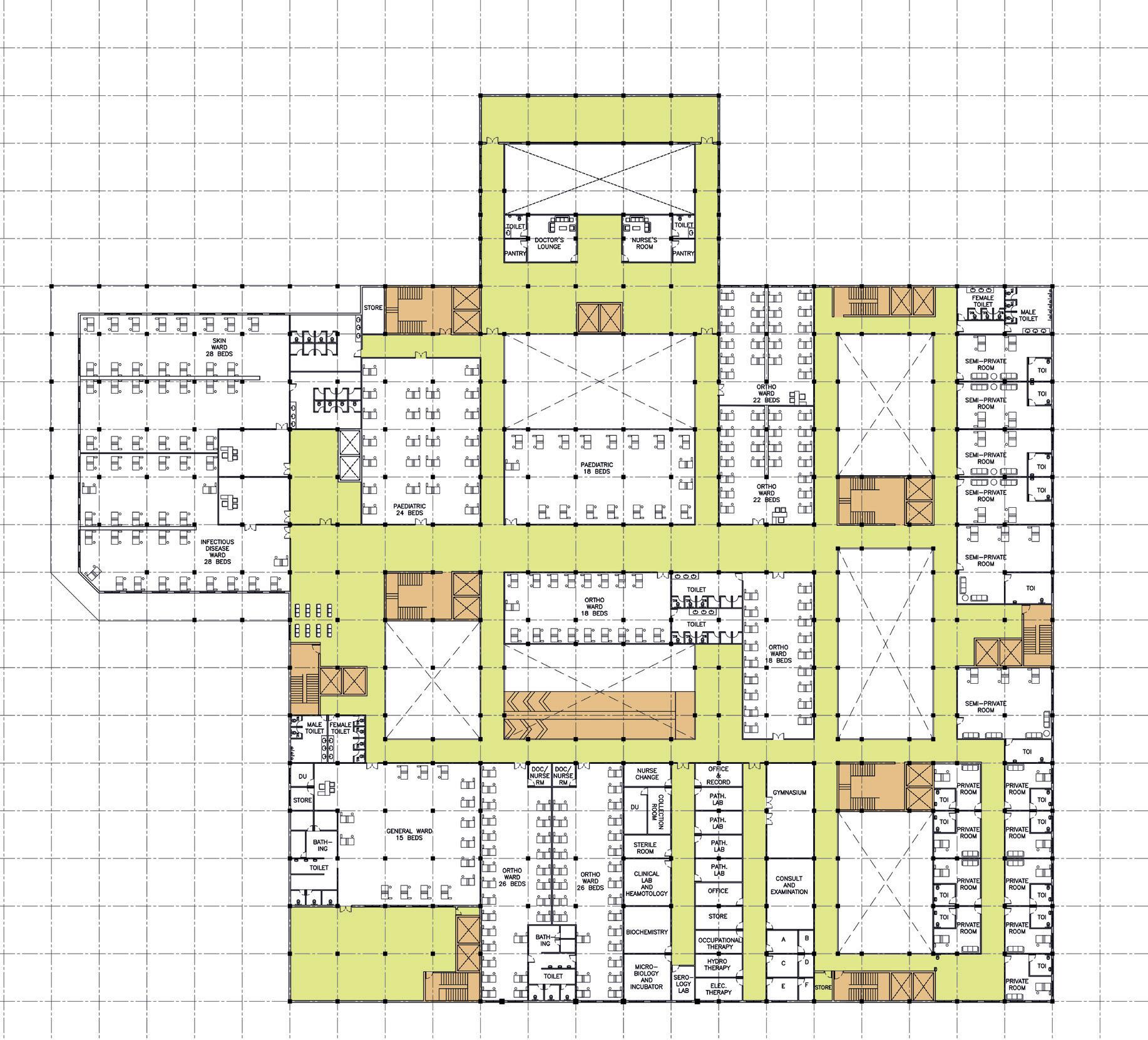 The brief is to design a 400 bedded hospital in New Chandigarh, Punjab. The aim is to plan a logical layout that minimizes the distance between rate public areas from service areas to maintain cleanliness and hygiene standards. Include centralized facilities such as diagnostic imaging, laboratories, multiple departments.