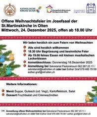 Wir laden ein zur traditionellen «Mitternachtsmesse» in der kath. Kirche in Gretzenbach am Mittwoch, 24. Dezember, um 22.30 Uhr mit Kaplan Jobin. Der Gottesdienst wird mit festlichen Weihnachtsliedern von der ökumenischen Chorgemeinschaft Däniken mitgestaltet, unter der Leitung von Roland Basler, an der Orgel begleitet von Urs Kuster.