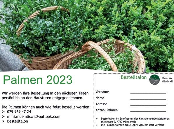 Für den PalmsonntagsGottesdienst vom 2. April würden wir gerne mit euch Palmen binden. Wir treffen uns am Samstag, 1. April um 9.30 Uhr bei Anja und Stefan Müller in der Bodenmatt. Anmeldung bis am Freitag, 24. März an: Christine Uebelhard, 079 667 80 20 (WhatsApp oder SMS).