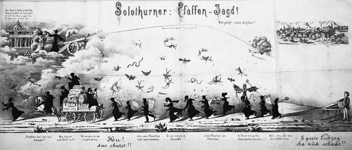«Solothurner Pfaffenjagd»: eine Zusammenstellung der Kulturkampfpolemik der Liberalen in Karikaturform um 1873, nach der Vertreibung von Bischof Eugène Lachat aus Solothurn.