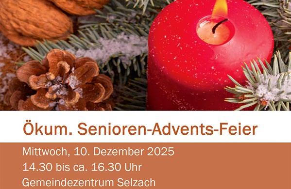 Markussaal, Bettlach Herzliche Einladung an alle zum Seniorentreff mit Adventsfeier. Anmeldungen bitte bis Freitag vor dem Seniorennachmittag an das Pfarreisekretariat 032 645 18 79 oder pfarramt.bettlach@wandflue.ch.