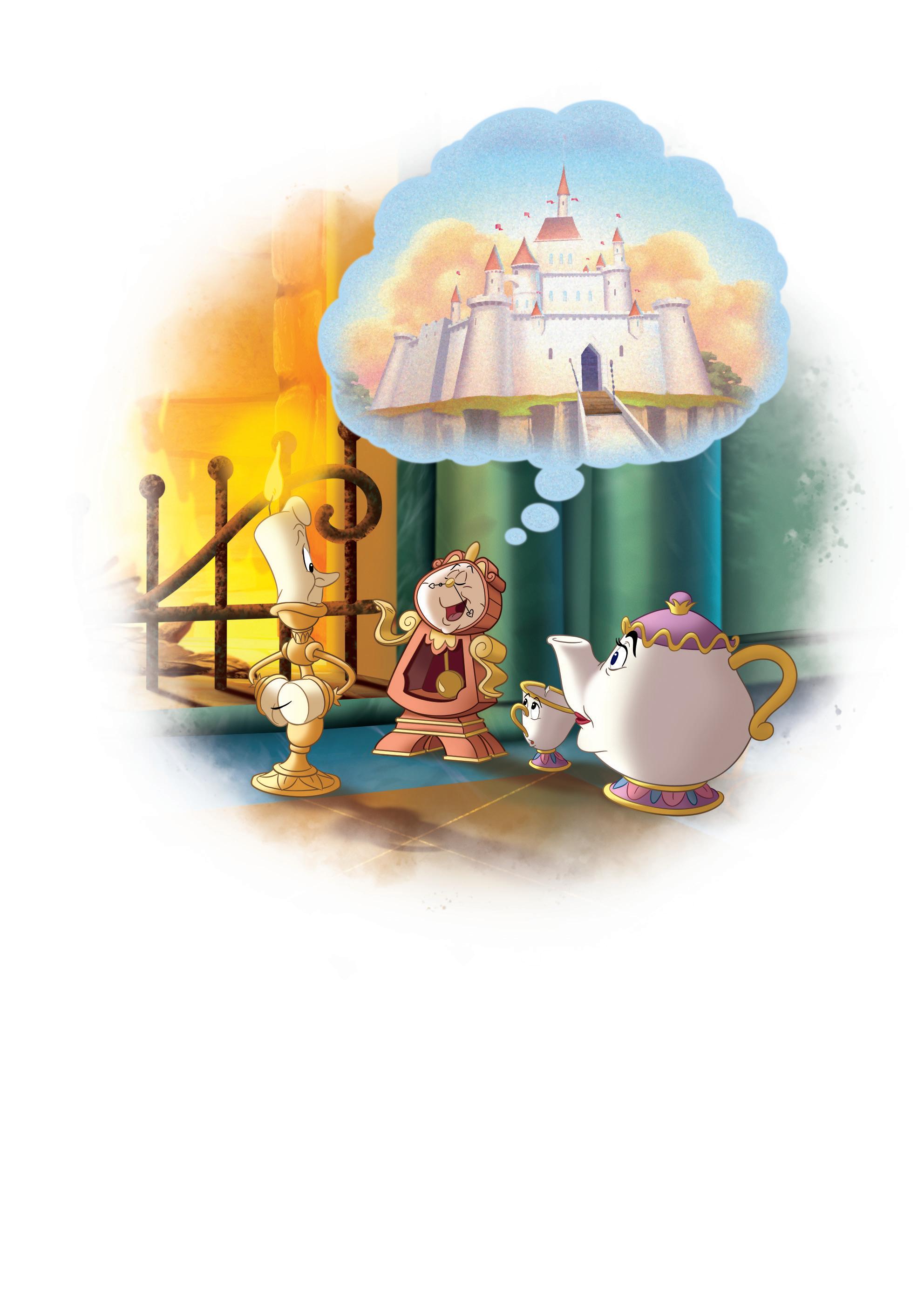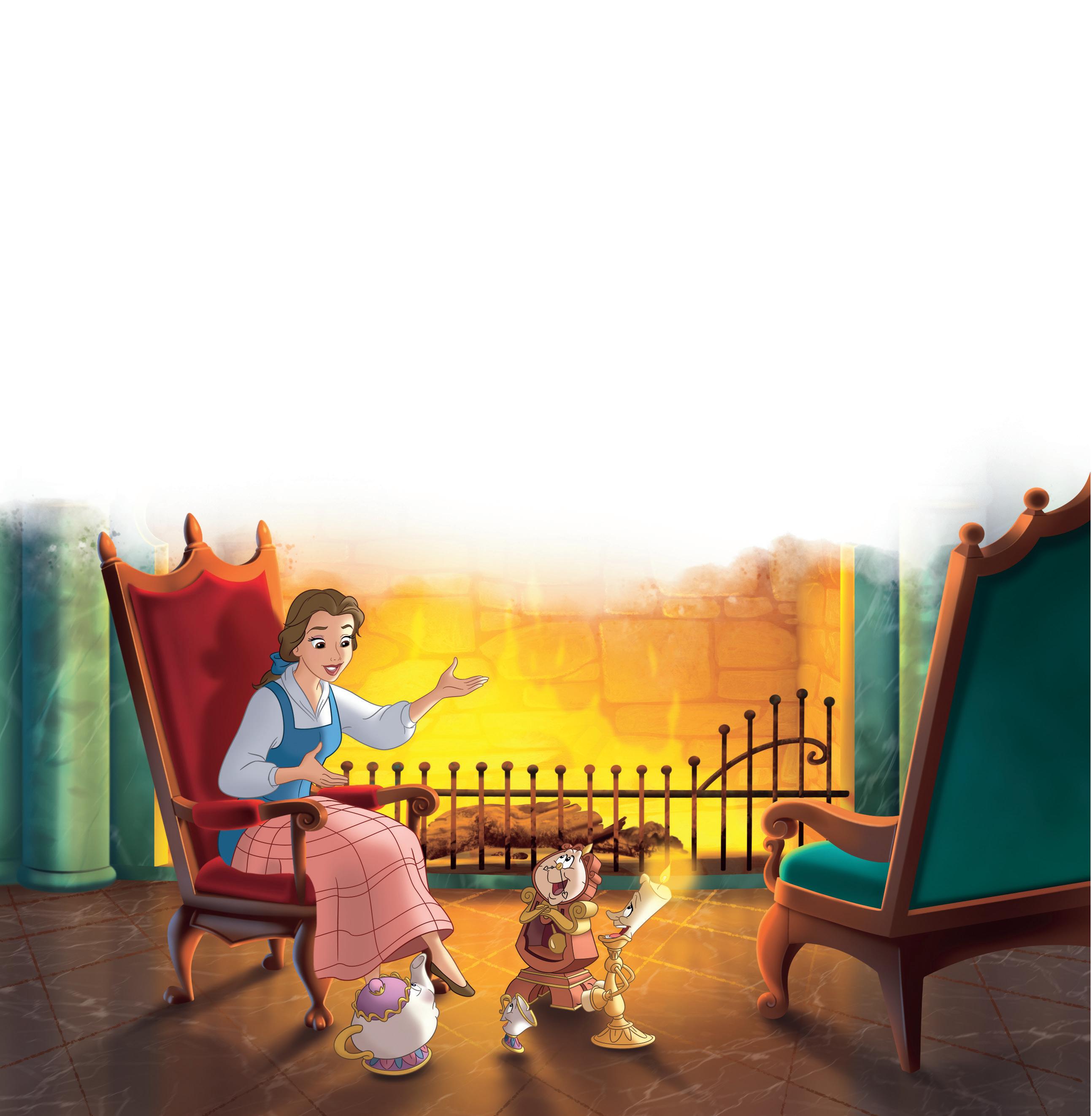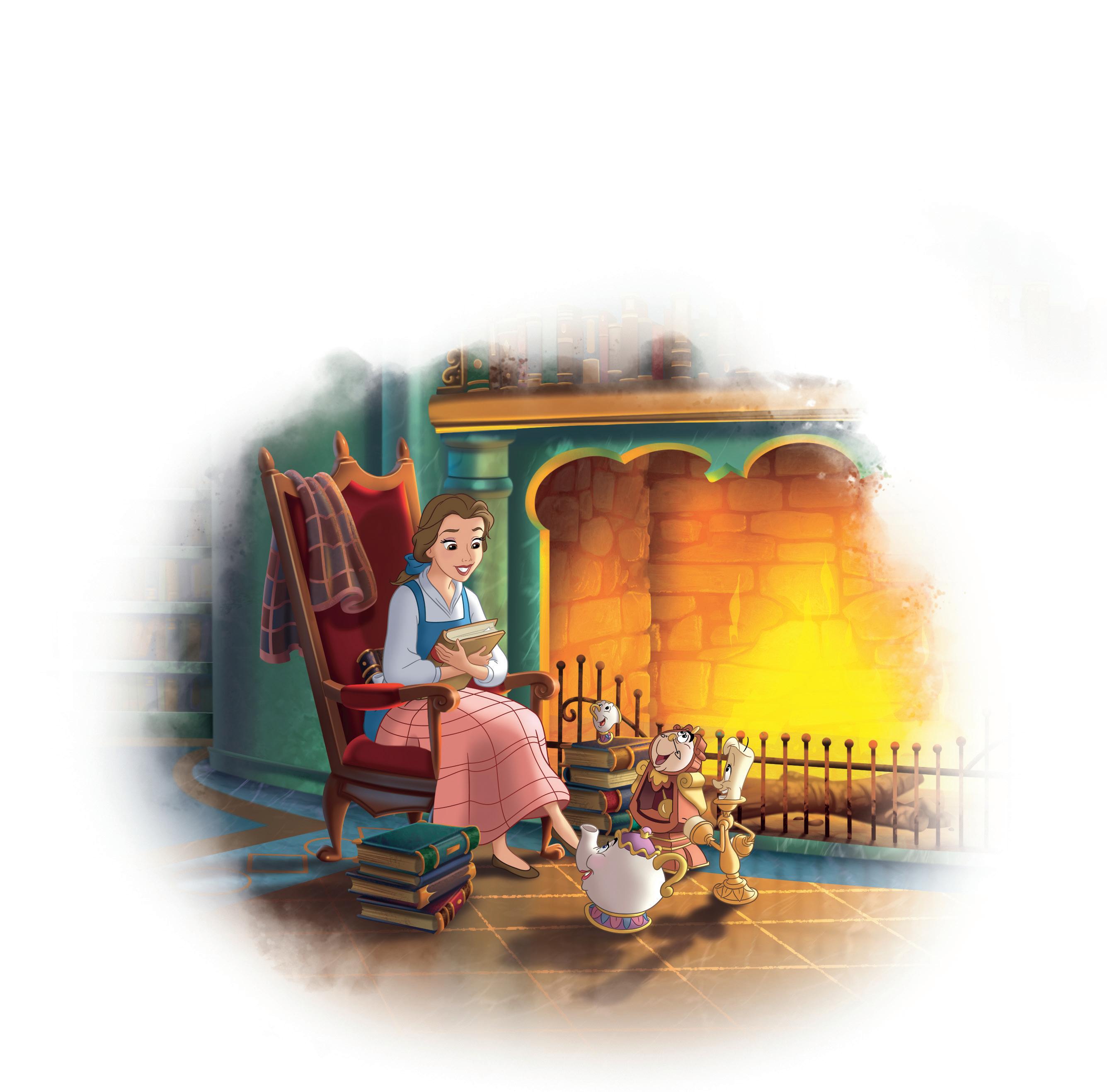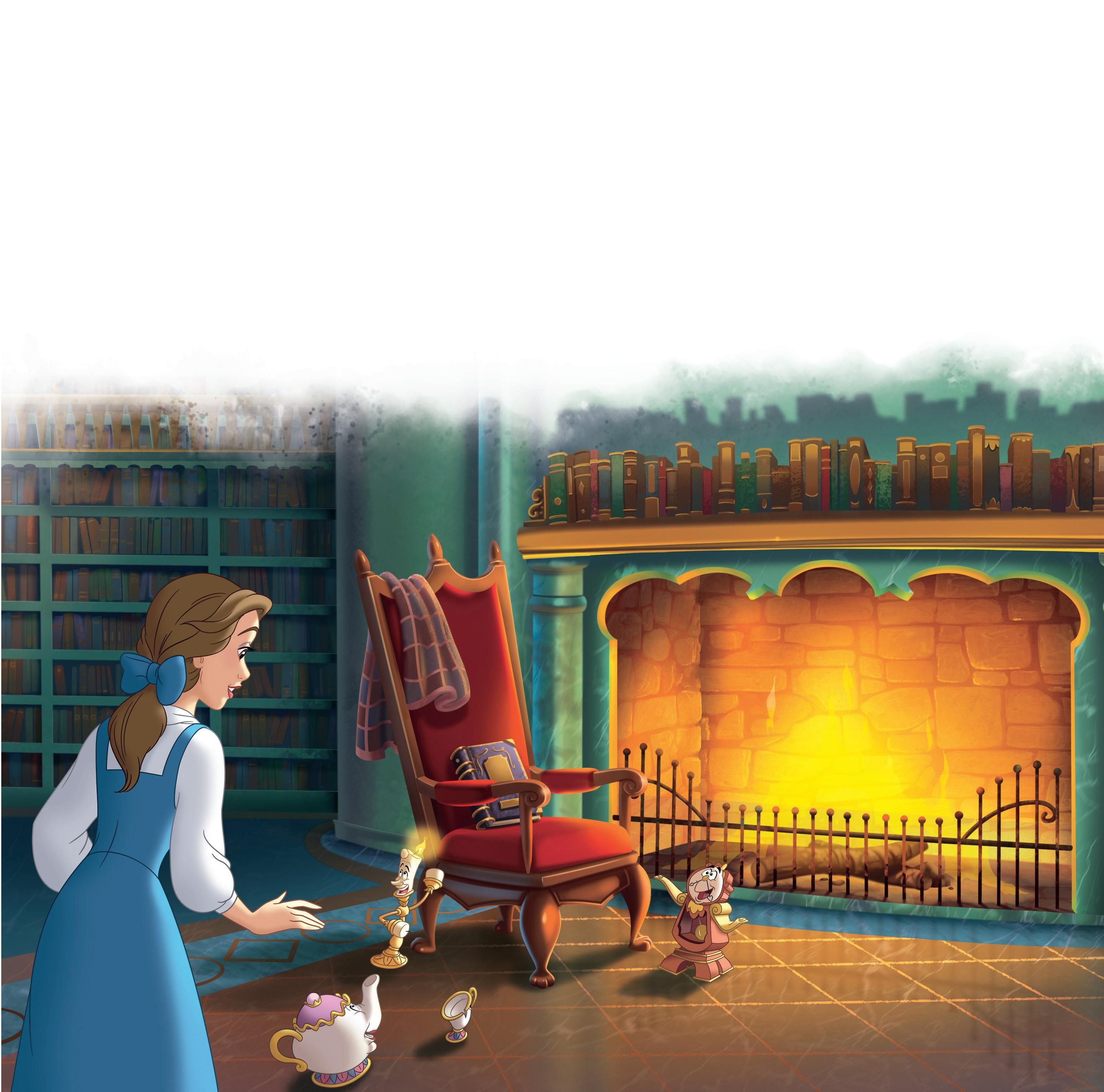 Lumière ja Könni odottelivat jo kirjastossa. Kaksikko oli siirtänyt Bellen lempituolin takan eteen. Sen selkänojalla lepäsi pehmoinen huopa, ja samettiistuimella nökötti paksu kirja.