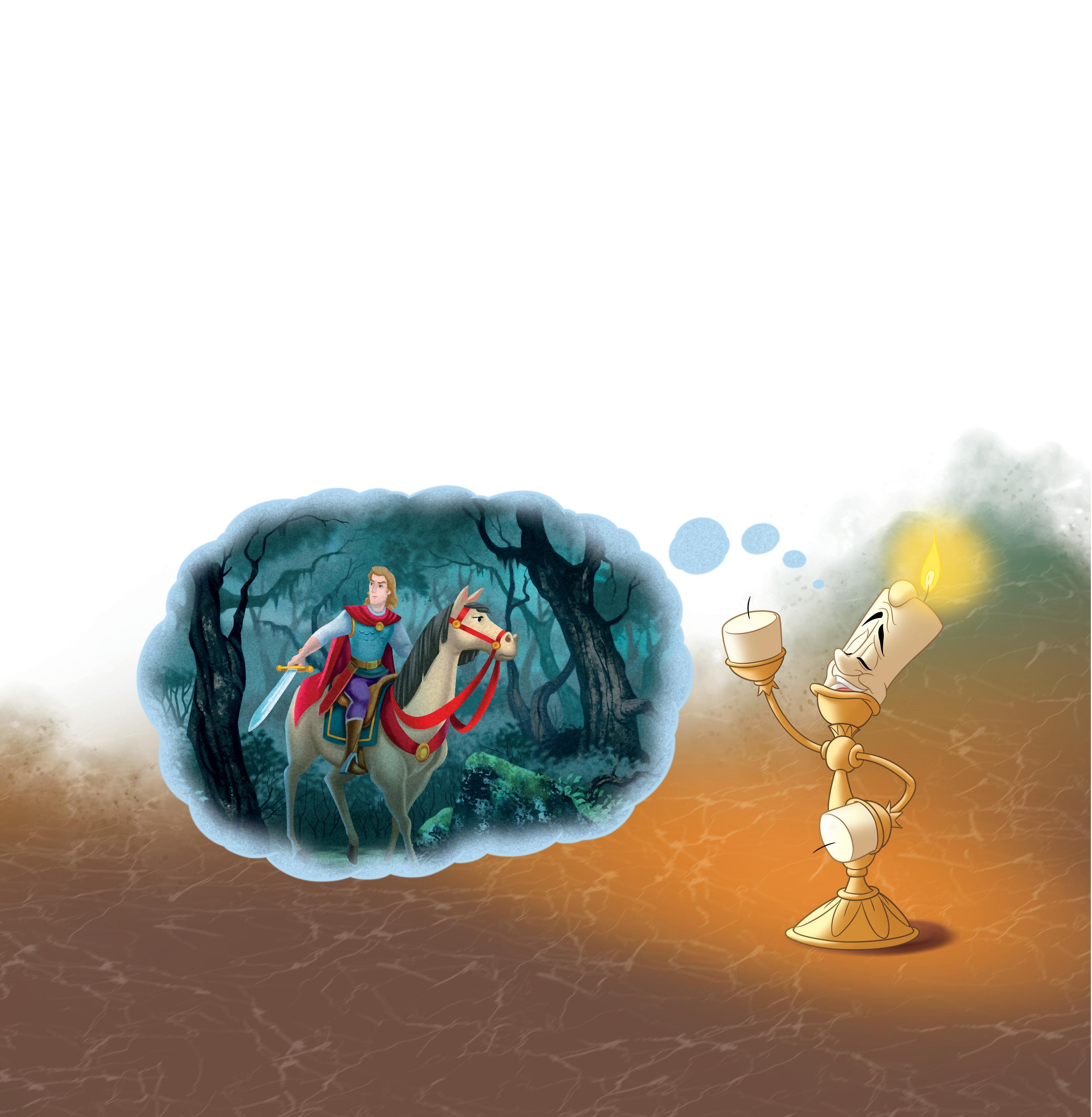 ”Mielelläni”, kynttelikkö vastasi. ”Eräänä päivänä sankarimme kuuli, että valtakunnassa asusteli vielä yksi lohikäärme. Sellaisen lähistöltä taas löytyy aina prinsessa. Niinpä ritari päätti etsiä lohikäärmeen ja neidon, sillä hän haaveili tosirakkaudesta. Hän satuloi ratsunsa ja taivalsi pilkkopimeän metsän halki.”