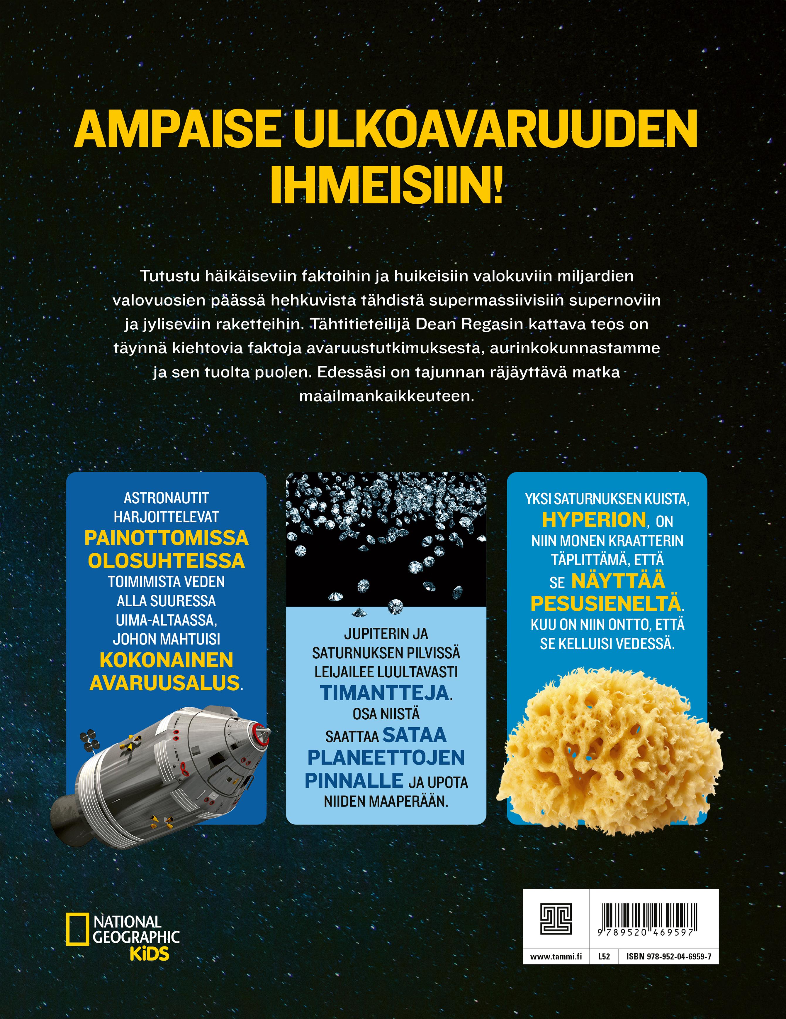Kun olin lapsi, minusta oli upeaa nähdä avaruuslennoilla otettuja kuvia planeetoista, videoita Kuun pinnalla pomppivista astronauteista ja teleskooppien nappaamia salaperäisiä näkyjä kaukaisista galakseista. Vaikka sinä ja minä emme vielä voikaan matkustaa avaruuteen, mielikuvituksemme lentoa ei estä mikään, ja tämän kirjan faktat ovat matkalippusi tähtiin. Määränpäänä voi olla mikä maailmankaikkeuden kolkka tahansa.