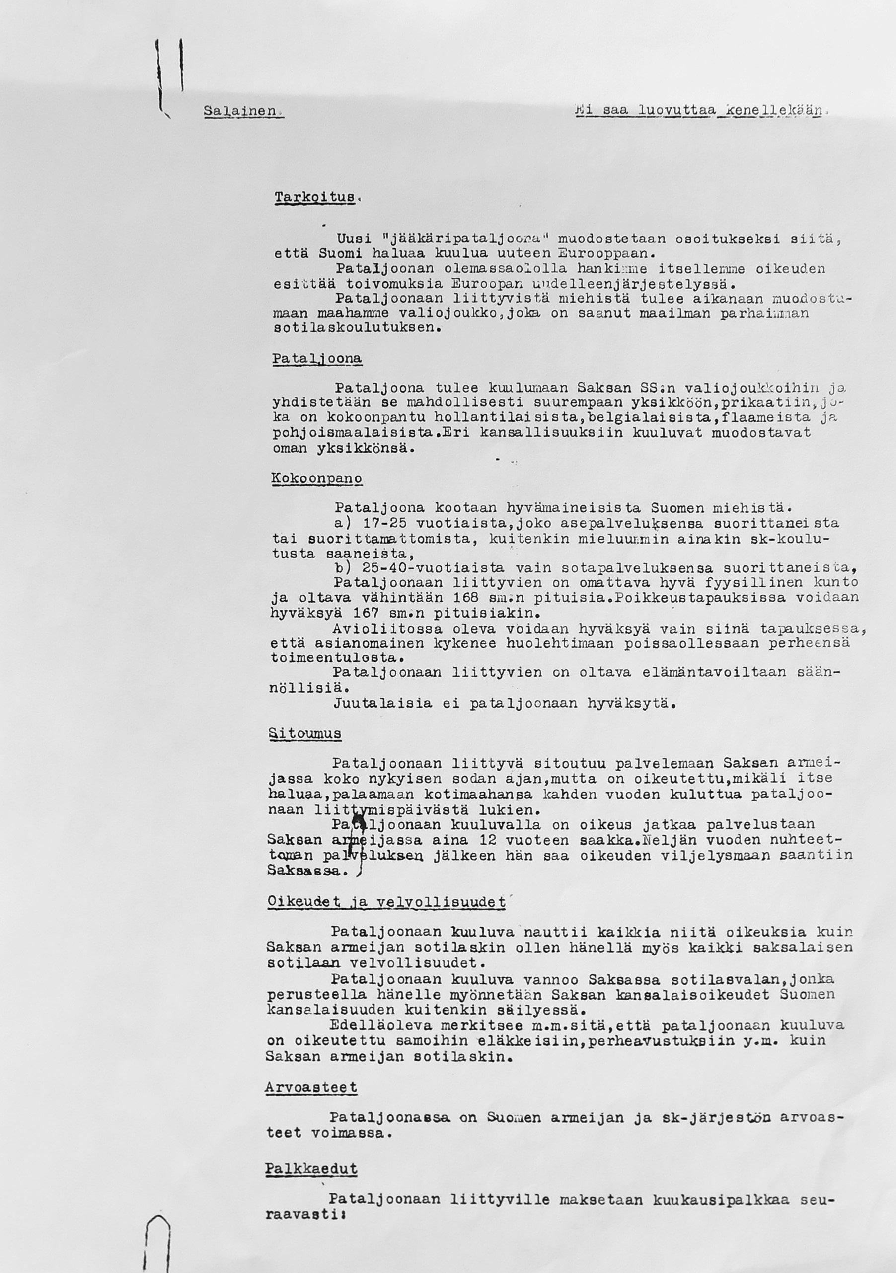 Saksaan lähteneet vapaaehtoiset olivat tavallisia suomalaisia miehiä, aivan kuin kotoisilla rintamilla taistelleet aseveljensä. Perusteel listen tutkimusten avulla on saatu kiitollisina tietää, että he eivät mis sään tapauksessa ole joukkona syyllistyneet niihin julmuuksiin, joita sekä Saksa että Neuvostoliitto toteuttivat. He tekivät sen, minkä isänmaa oli heille tehtäväksi antanut, ilmeisesti siinä määrin kunni alla kuin se oli noissa olosuhteissa mahdollista. Heitä ei enää voi kiit tää, eikä heidän myöhempää kohteluaan voi pyytää anteeksi, mutta kunnioittaa voi siinä missä muitakin vapaussankareita.