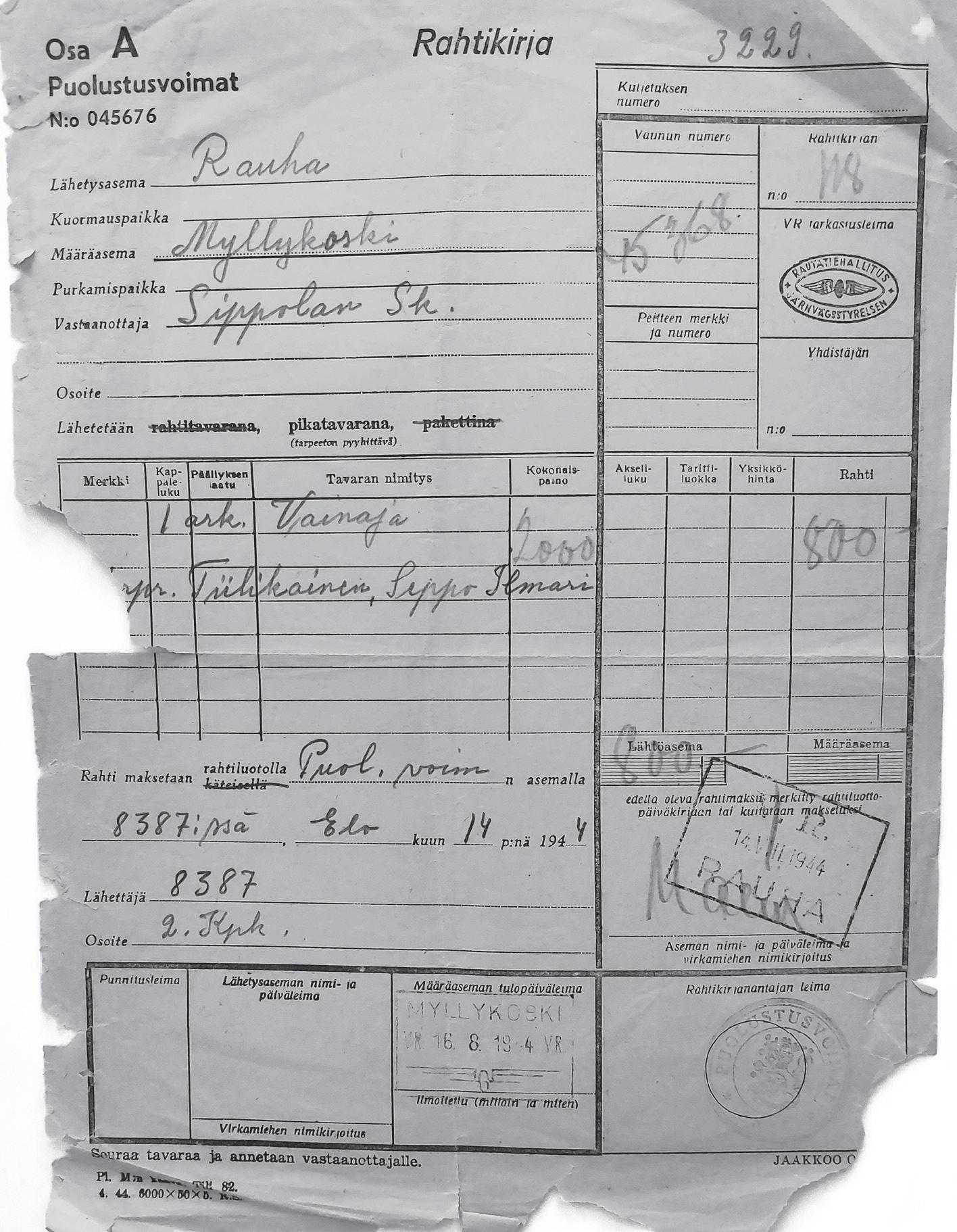 Kaikki laatikot oli luetteloitu armeijan tapaan huolellisesti. Yksi pienimmistä painoi vain kaksi kiloa, mutta senkin kuljetuk sesta perittiin puolustusvoimilta asiaankuuluva hinta, kahdeksansataa tuon aikaista markkaa. Matka kesti kauan – Sepon laatikko purettiin junasta määräasemalla Myllykoskella kahdeksantena toista elokuuta ja kuljetettiin monien muiden mukana jonnekin suojeluskuntapiirin latoon, kauas muista rakennuksista. Vastassa oli vaiteliaita, rasittuneen näköisiä lottia, jotka hiljaisina paljon kaan puhumatta kantoivat laatikot sisään ja kiittivät ne tuoneita suojeluskunnan ukkoja. Nämä poistuivat aikailematta – haju ladon ympärillä oli hirveä.
