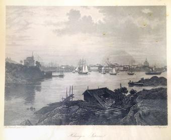 satama vuonna 1871 ennen sähkön ja puhelimen tuloa. B. Reinholdin teräspiirros teoksesta En resa i Finland (1873)