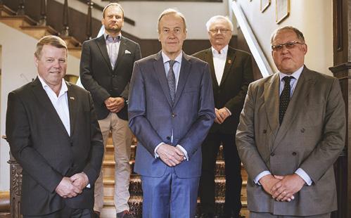 Det sista förvaltningsrådet för Dan. Joh. Wadéns fond. Från vänster vice ordförande Ilkka Mäkelä, Kristian Gerkman, ordförande Henry Wiklund, Taito Tuunanen och ombudsman Mikael Wahlström.
