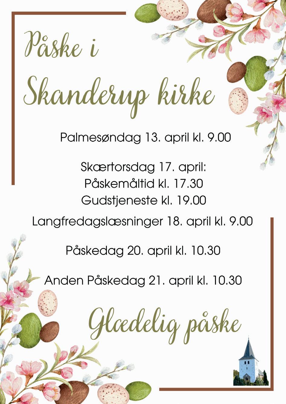 Skærtorsdag d. 17. april kl. 17.30 mødes vi i Kirkehuset til et fælles påskemåltid. Her nyder vi måltidsfællesskabet og indleder påskedagene sammen. Efter spisningen går vi over i kirken til en stemningsfuld aftengudstjeneste kl. 19.00. Måltidet koster 60 kr. for voksne og 30 kr. for børn. Tilmelding til Gerda senest søndagen før på 40968386 eller kirkegaarden@skanderupsogn.dk.
