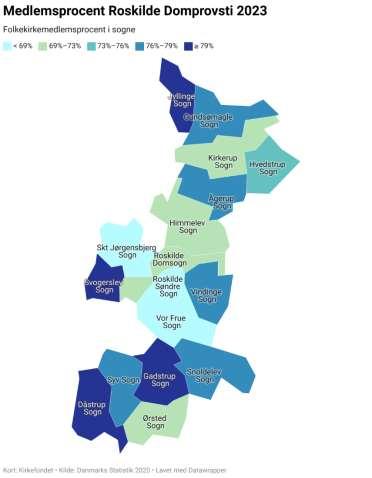 ▪ Folkekirkemedlemskabet i Roskilde Domprovsti er pr. 1.1.2023 på 72,5 % svarende til 65.602 personer