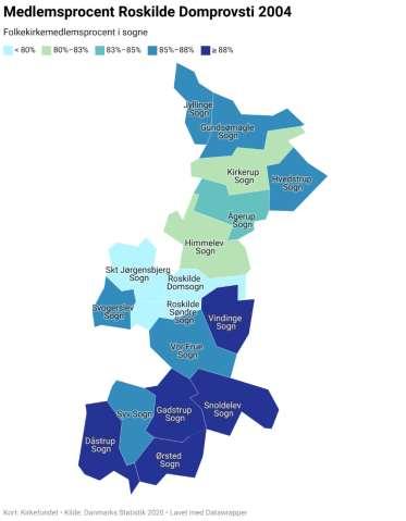 Diagrammet nedenfor sammenligner udviklingen i medlemsprocenten blandt danske børn mellem 0-4 år hhv. på landsplan og i Roskilde Domprovsti i perioden 2004-2020. Som det ses, gælder det både på landsplan og i provstiet, at medlemsprocenten blandt de danske 0-4 årige er kontinuerligt faldende, og at udviklingen i provstiet følger udviklingen på landsplan