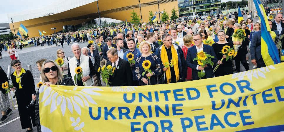 MIELENOSOITUS UKRAINAN puolesta oli vaikuttava: ihmisillä oli käsissään auringonkukkia ja lippuja, jotka värjäsivät kulkueen Ukrainan väreihin.