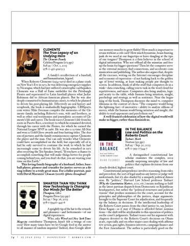 our memory muscles to grow flabby? How much is important to retain without a crib card? How much byzantine, brain-busting junk do we need at our fingertips or leave dangling at the tips of our tongues? Thompson is a firm believer in the school of digital information. Why not offload all the minutiae and free up the brain for bigger questions? Then let the computer serve as the external memory, find connections, and accelerate communication and publishing. The author also argues that, despite all the excesses, writing on the Internet encourages discipline and economy of expression—if not harking back to the golden age of letter writing, at least making people put thought to screen. In addition, think of all the stuff that computers do in a wink—data crunching, calling you to task in the word cloud for repetitiveness, and more. Computers also bring analysis, logic and acuity to the table, while humans bring intuition, insight, psychology and strategy, as well as sentience. Near the beginning of the book, Thompson discusses the mind vs. computer dilemma in the context of chess: “The computer would bring the lightning fast—if uncreative—ability to analyze zillions of moves, while the human would bring intuition and insight, the ability to read opponents and psych them out.” A well-framed celebration of how the digital world will make us bigger, rather than diminish us.