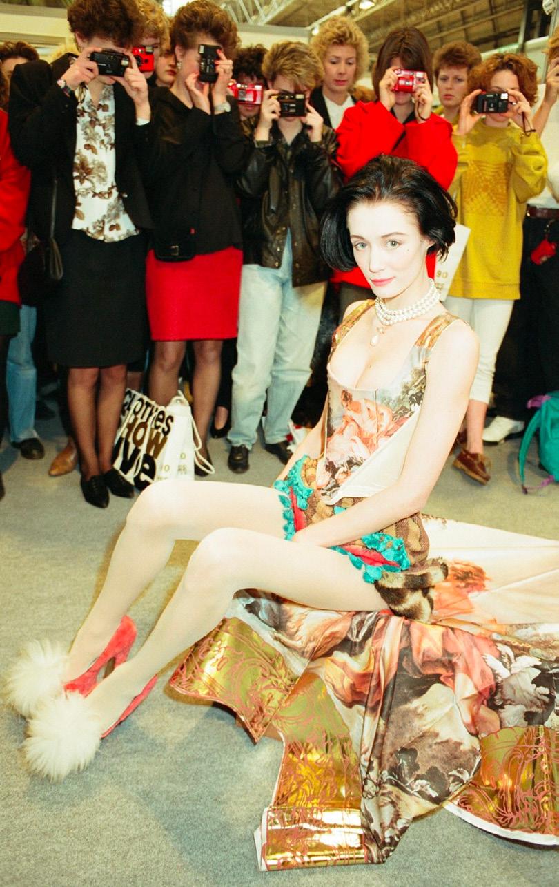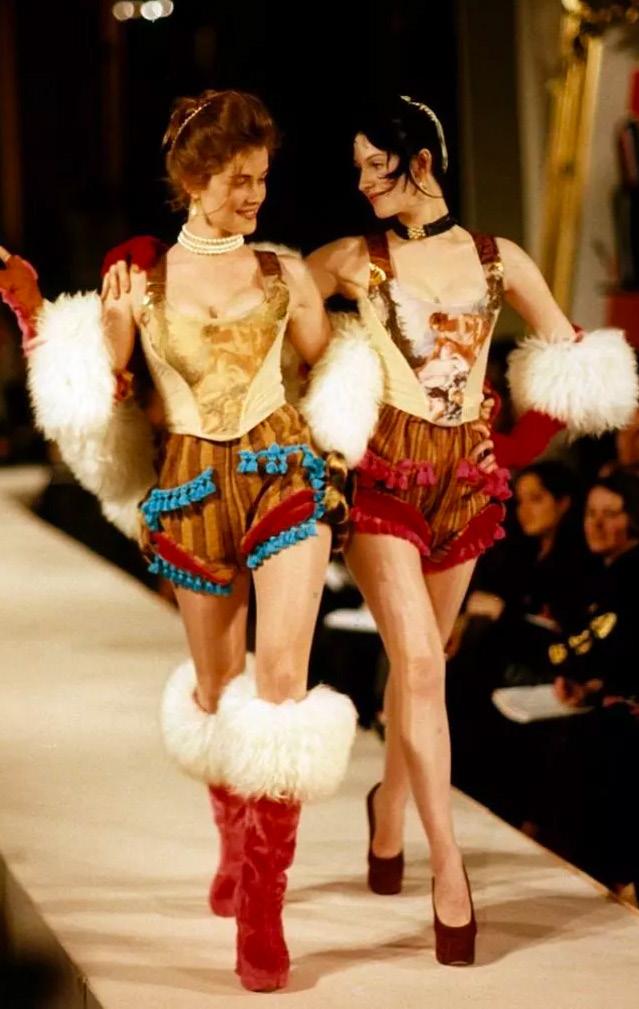 The corset’s design inspiration, François Boucher’s painting Daphnis and Chloe, depicts a romanticized scene from an ancient Greek novel. The painting features two lovers embracing in a pastoral setting, with lush greenery and soft colors evoking a sense of sensuality and beauty. Westwood honed in on the erotic aspect of the painting, using it as inspiration for her corset design and the kissing on stage. The Boucher corset represents a fusion of art and fashion, with Westwood’s appreciation for classical art informing her innovative approach to design. By drawing inspiration from François Boucher’s painting, Westwood not only paid homage to the artistry of the past but also challenged societal perceptions of beauty and sexuality, transforming the corset into a powerful statement of artistic expression.