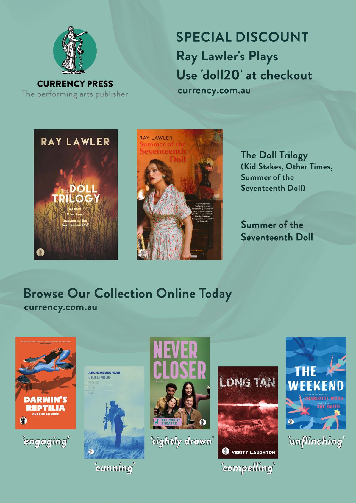 Lawler wrote two more plays featuring characters from The Doll: Kid Stakes (1975) and Other Times (1976). In 1978 the three plays were published by Currency Press as The Doll Trilogy. Lawler’s other plays include Hal’s Belles (1945), Cradle of Thunder (1952), The Piccadilly Bushman (1959), The Unshaven Cheek (1963), A Breach in the Wall (1967), The Man Who Shot the Albatross (1972), and Godsend (1982).