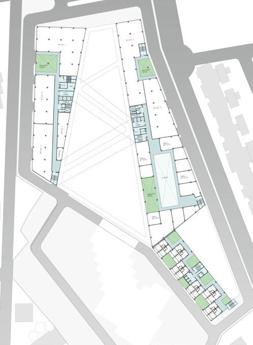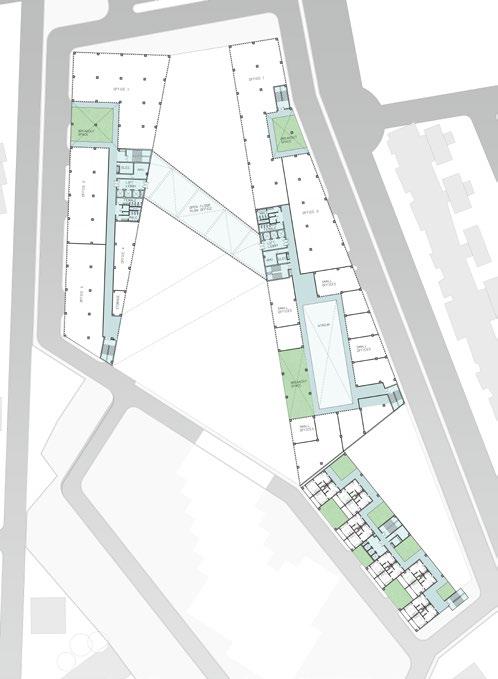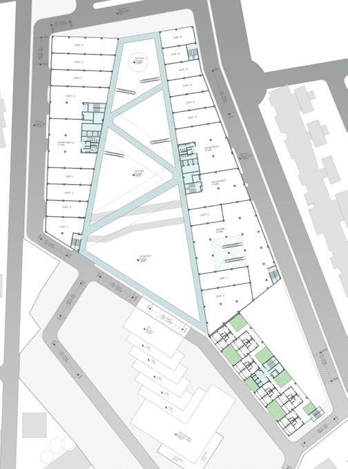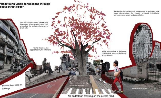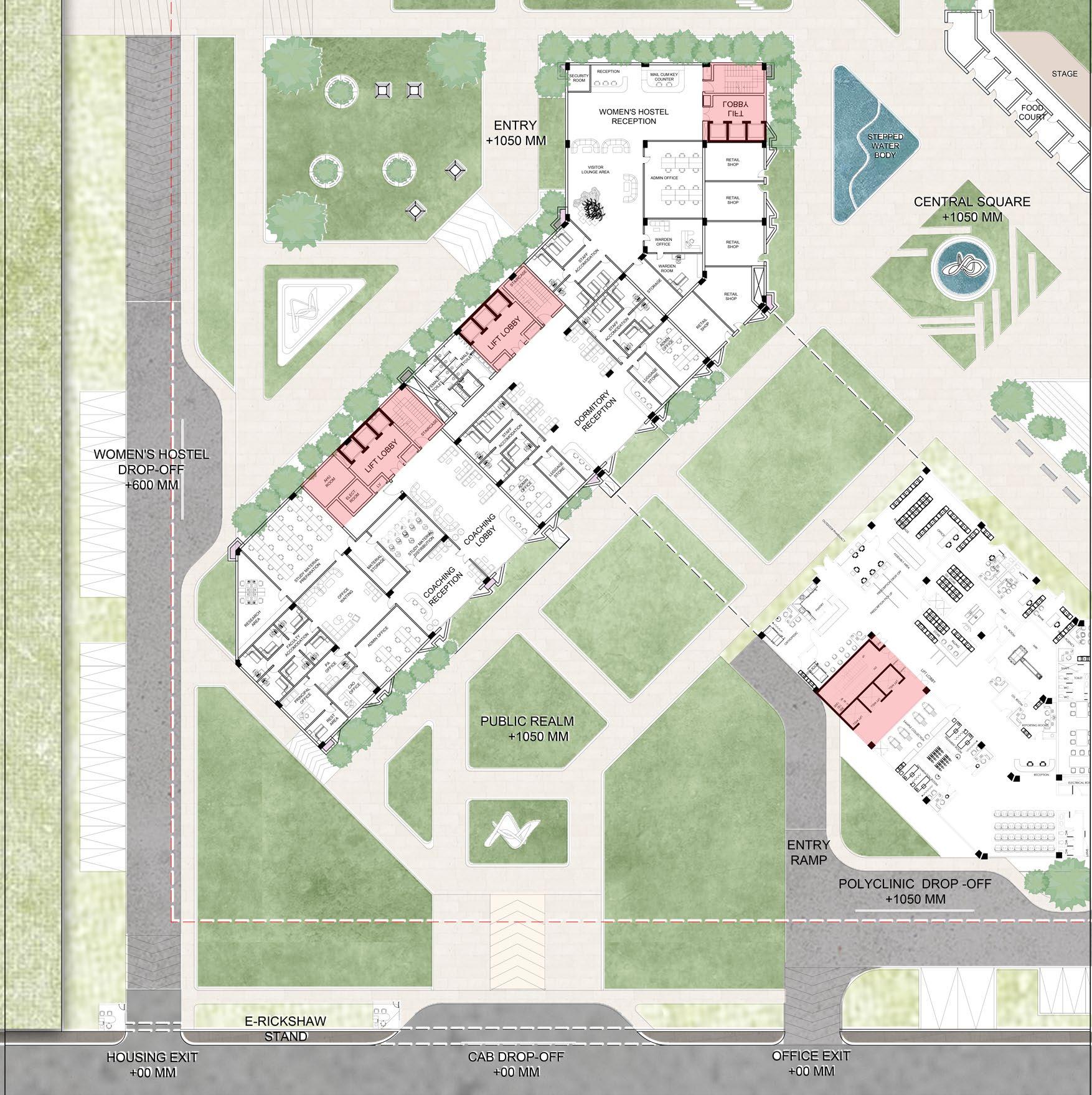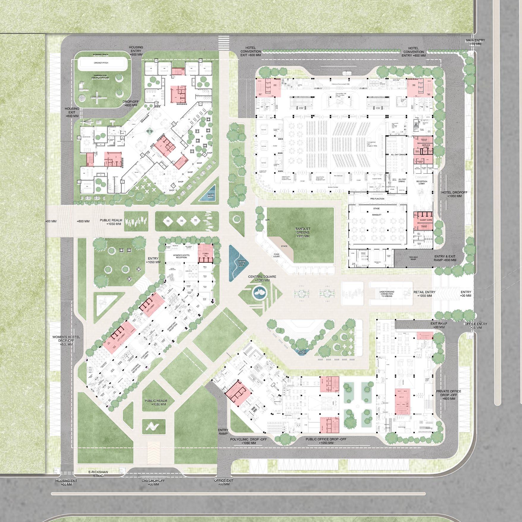 Our vision is to create a contextually integrated urban environment that embodies the unique character of the locale while expressing a balanced relationship between built and green spaces. For this, we understood the major connecting axeses to the site. We identified two major axises: one connecting the greens and residential on the opposite edge to our site; and the other diagonal axis connecting the pedestrians from the metro. Apart from this, we identified the need to establish smaller connections to the future development and larger proposed greens.