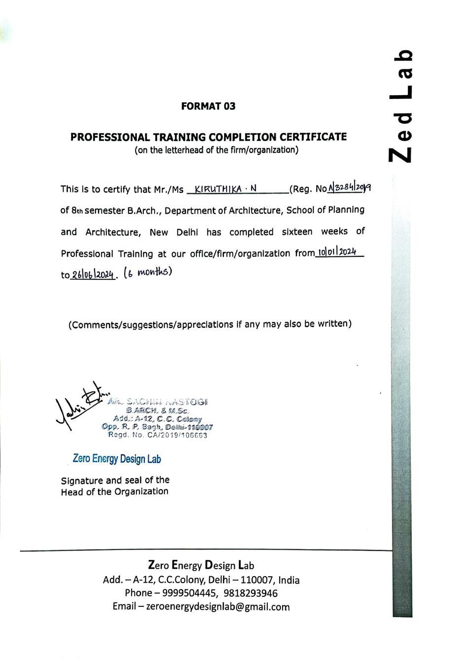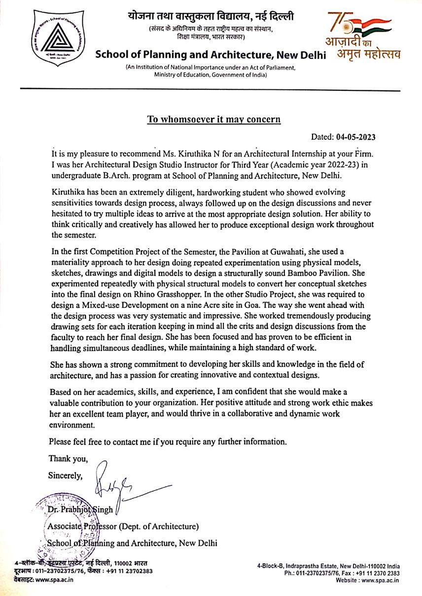 This is to certify that Ms Kiruthika N student of B.Arch. 6th semester, 3rd year from School of Planning and Architecture, New Delhi (enrolment no.: A/3284/2019) has successfully completed her 3-month internship (from 30th Jan- 29th Apr 2023) at Sandal Kapoor Associates, New Delhi