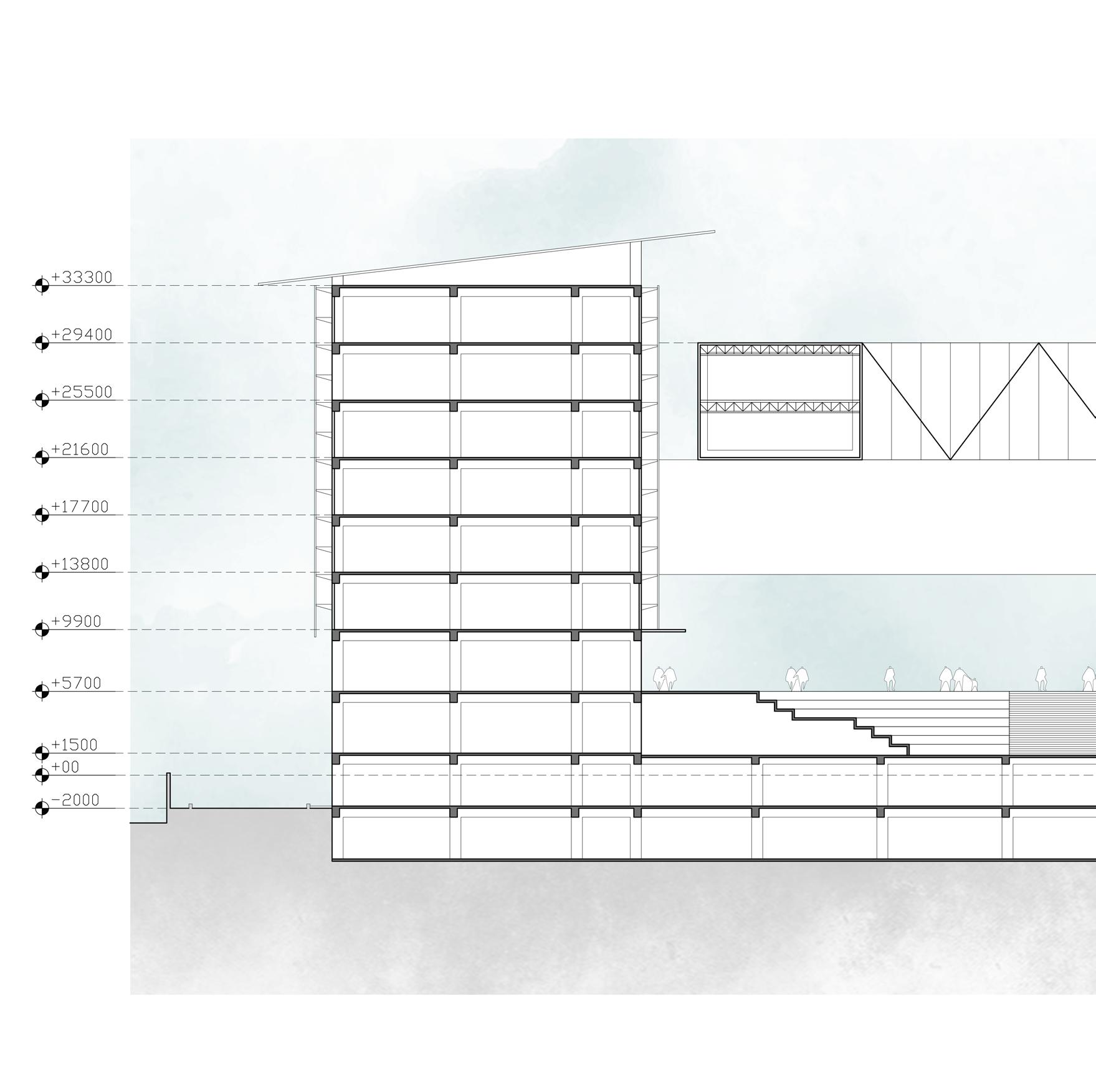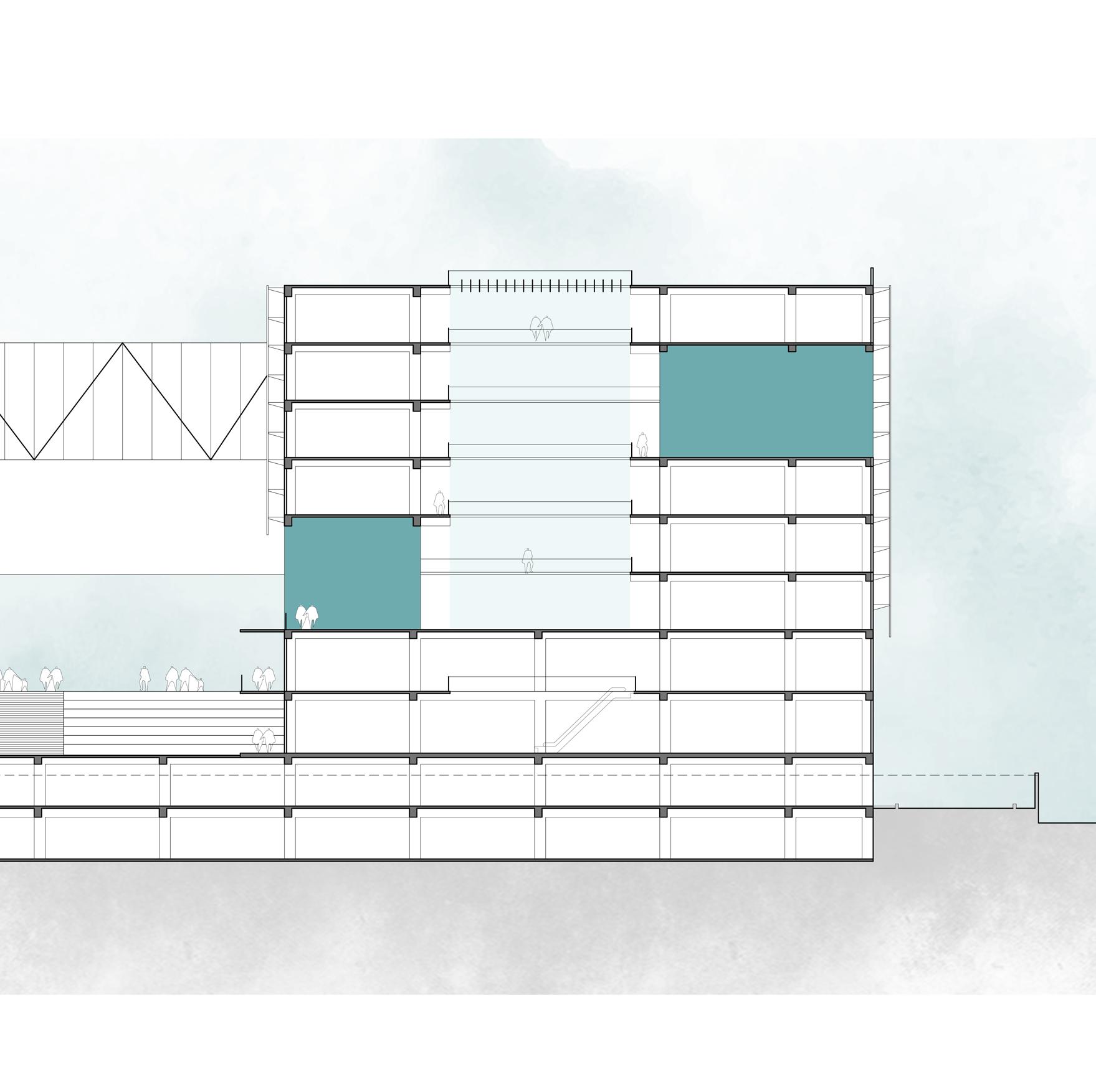 A mixed use Development for the Goa Devolopment Authority, with a built-up of 50000 sqm. The site faces the Zuari river and has excellent views to the dona paula beach. Taking advantage of the site vantage point, the design immerses the people into an experince of feeling the river through the narrow entrance which gradually opens up to a grand plaza with huge building bridges crossing overhead. The retail streets of the building engage crowds throughout the nights, keeping alive the tradition of the infamous Goa Night Markets. The offices can continue to function as a separate entity while still engaging with the conversation of the city.