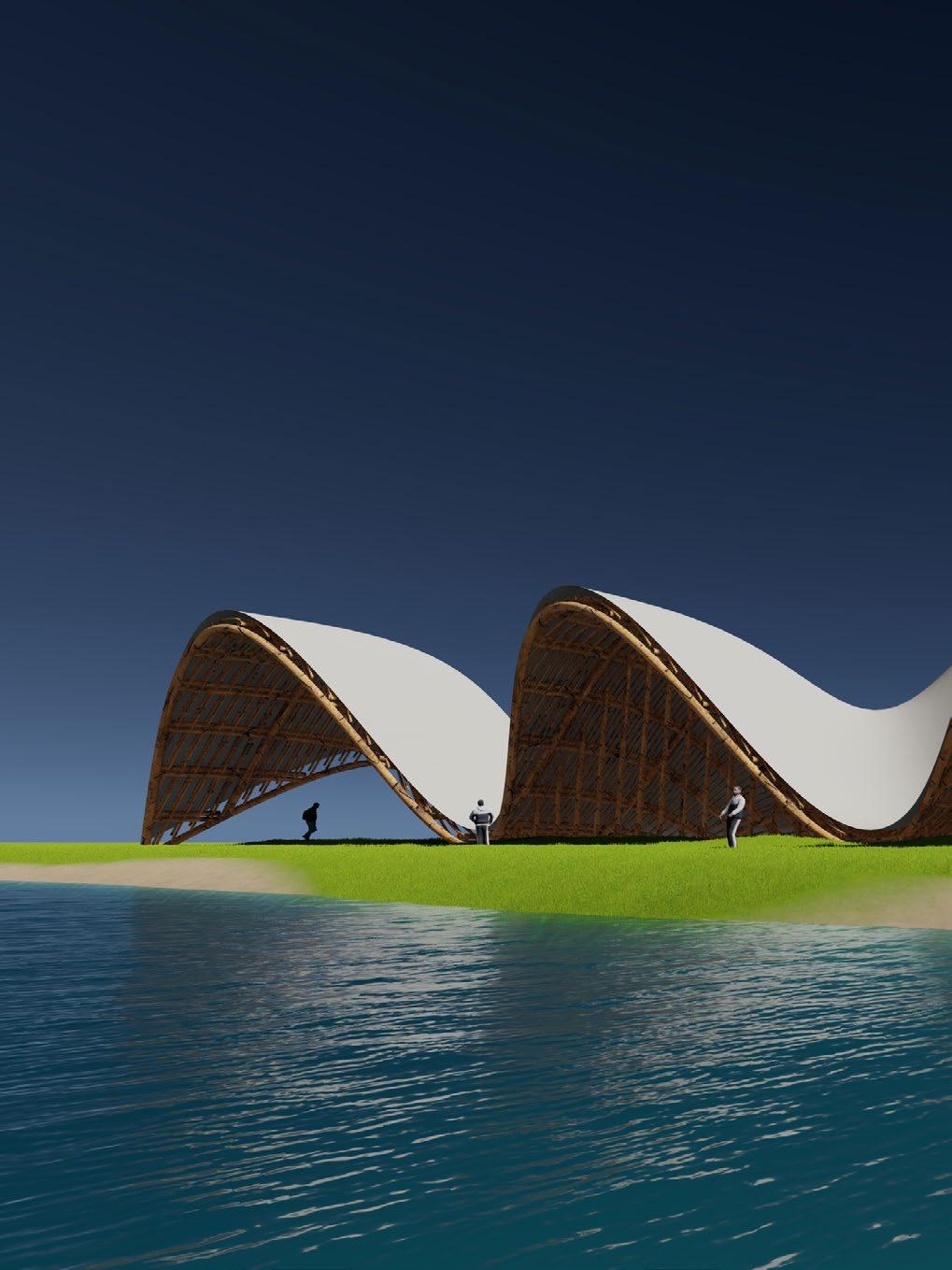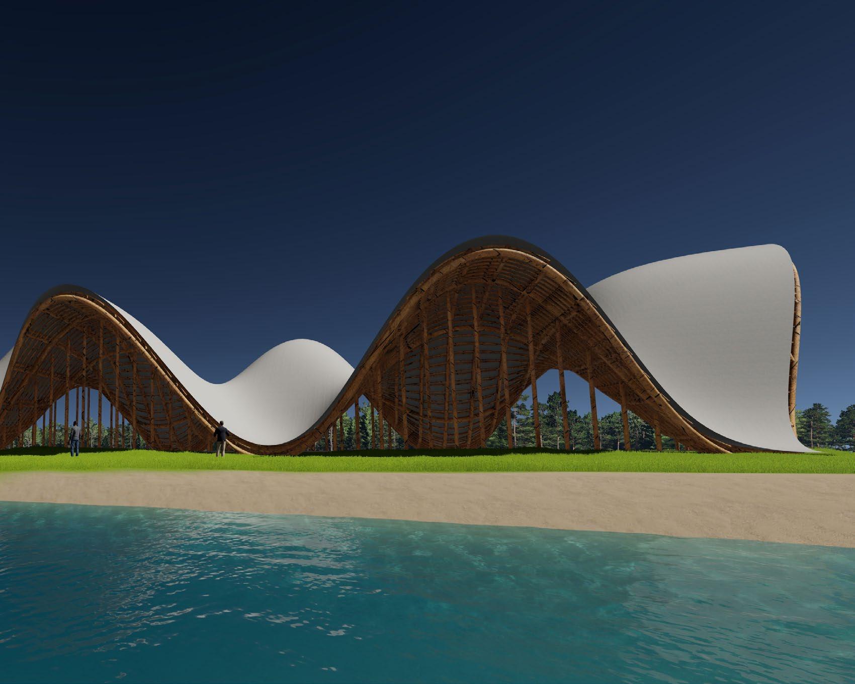 The word “MOONGILI” is based on ‘Moongil’ , the Tamil word for Bamboo. The form revolves around the flow and curves of bamboo as a structural Material. The form is derived from a carefully curated set of sine curves with alternation of the curves on the opposite edge creating a continuous flow. The pavillion is divided into two blocks, Private Admin Block and the Public Experiectial Block, based on the area functions. The Experiential block encompasses the Grand triple-height Exhibition Area and the Gaming area opening towards the Roadside. The Display, Demo and Creative Areas open out in the lakeside.