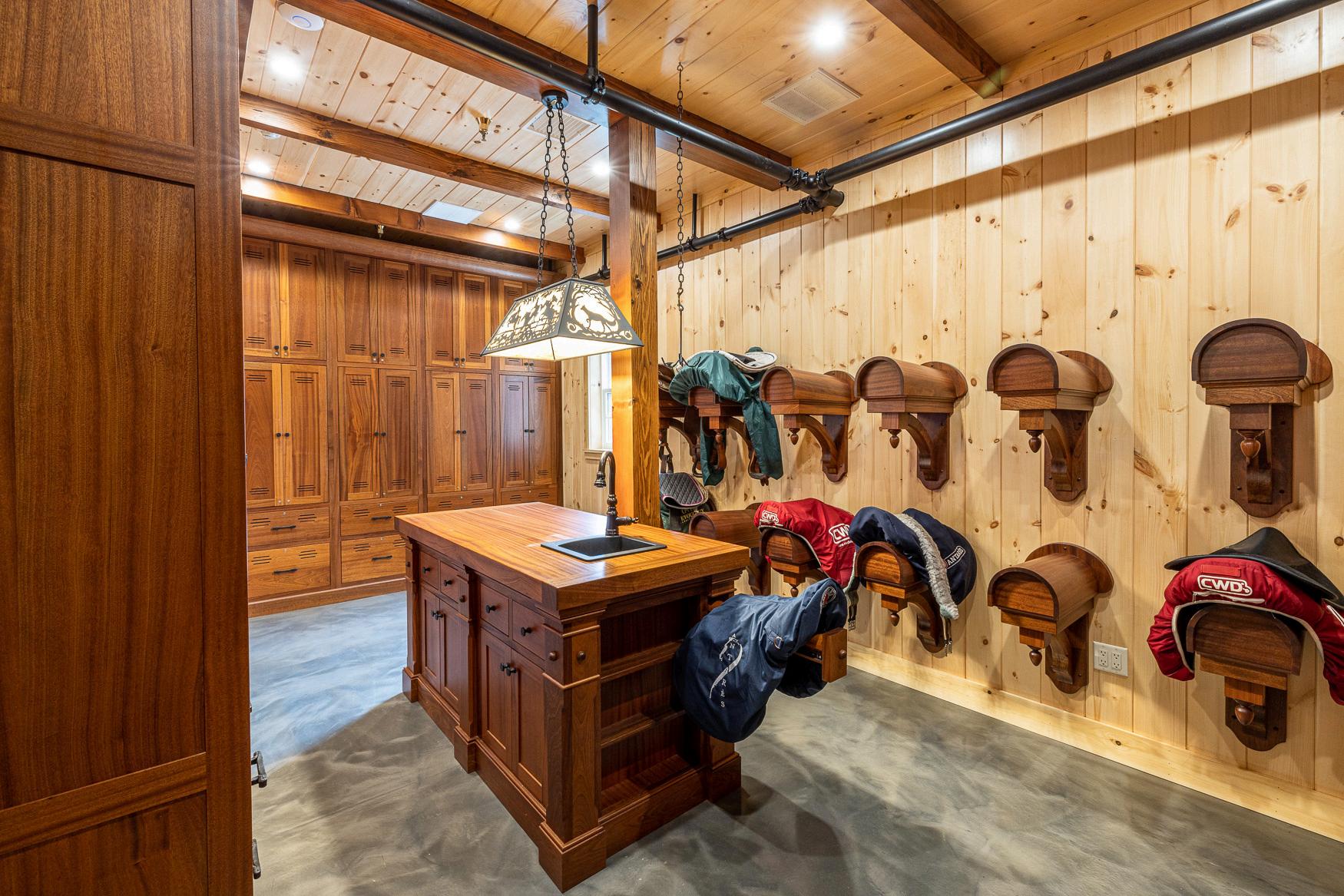 The master construction plan was completed in stages, starting with the house, followed by some accessory buildings and finally the barn and indoor arena. Gary built their previous home in the Adirondack style which they wanted to continue at the new location, liking the natural elements: stone, wood and a rustic look. The house and barn have fieldstone on the first floors sourced from the property. Mid-Atlantic Timberframes provided the timber for the structures.