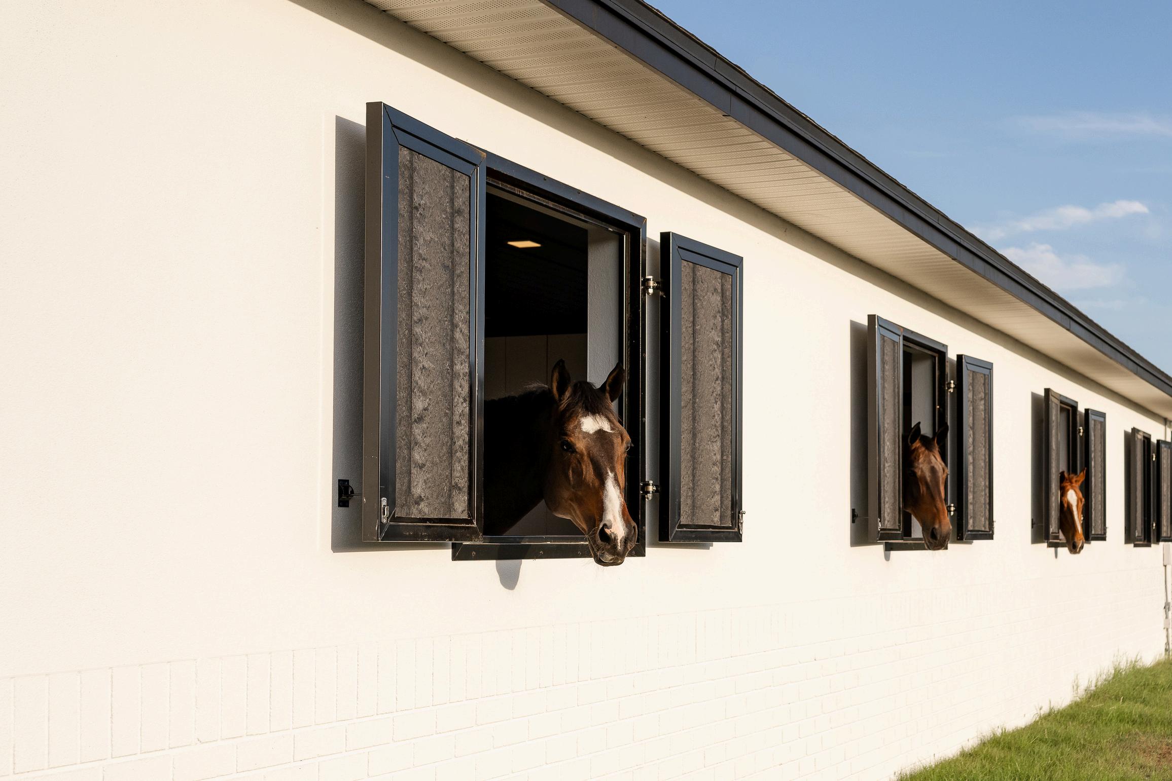 Inside, the well ventilated stable offers ample airflow for its equine residents. There are 20 box stalls in the barn, with 10 on each side The barn is divided in half, each set of stalls can function independently from one another, making feeding and tacking up a breeze