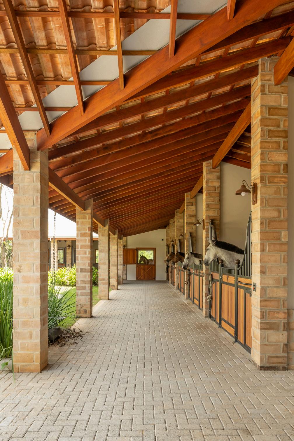 The biggest challenge for the firm was creating stalls for show jumpers who were used to being in completely enclosed stalls in previous barns. Estudio Balzano embraced an open concept design between the stalls that allowed for controlled contact with the other horses. Some division near the feeders was kept in place, but the horses can socialize between stalls and still retreat if they desire. Rubber pavers are found throughout the barn to create a safe, non-slip surface. The modern and beautiful light fixtures are from a local shop in Argentina