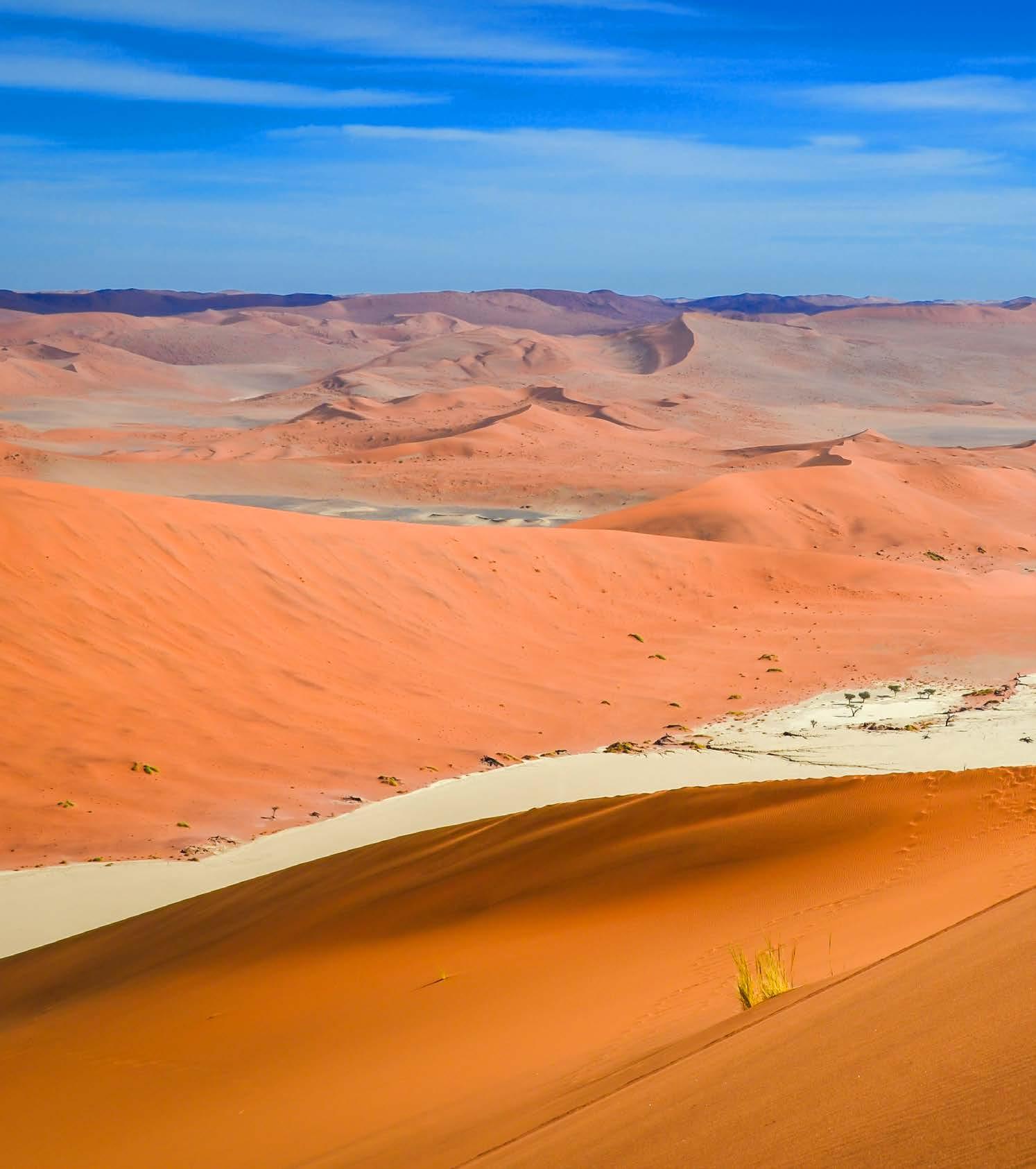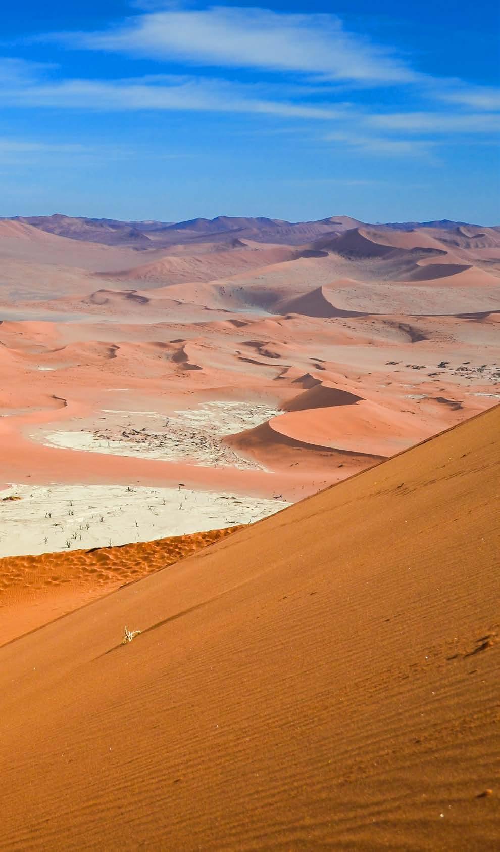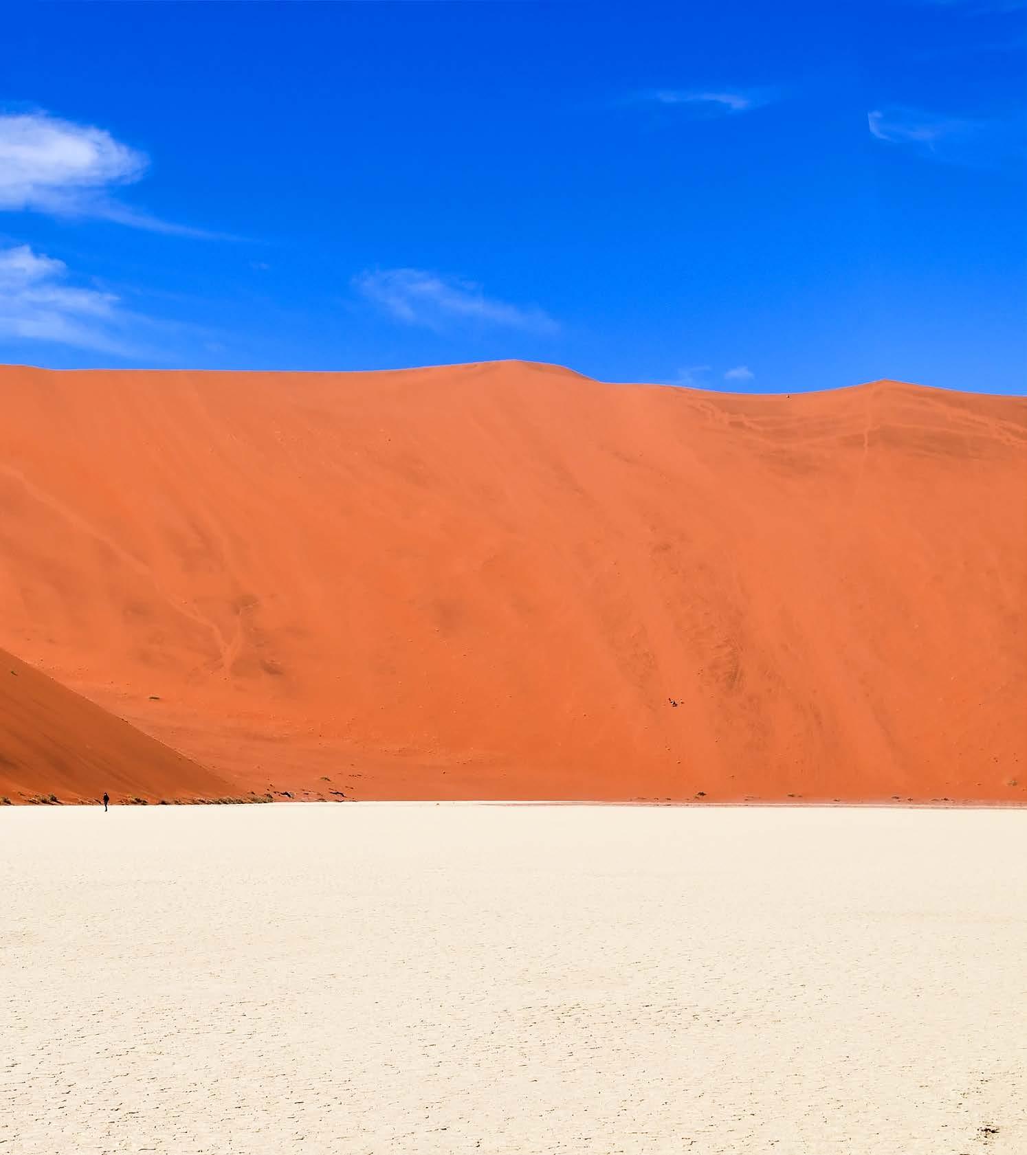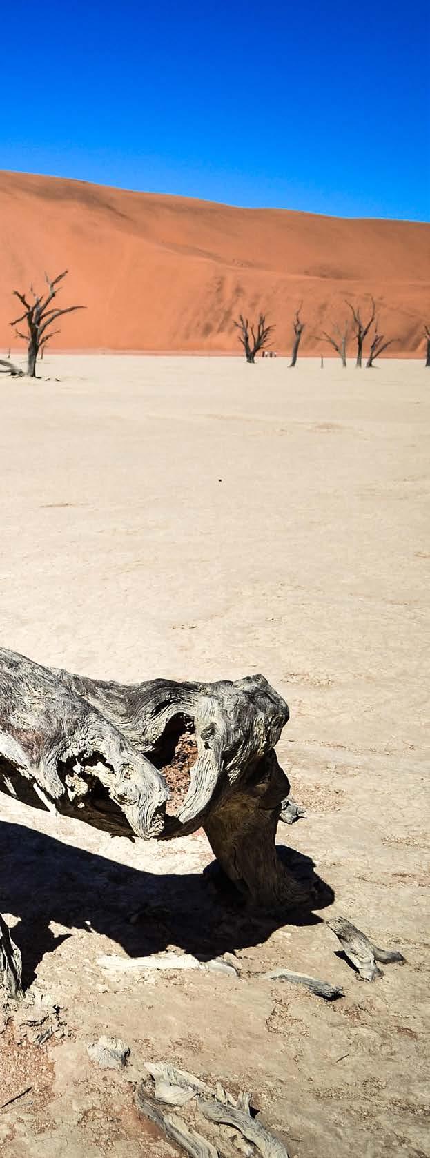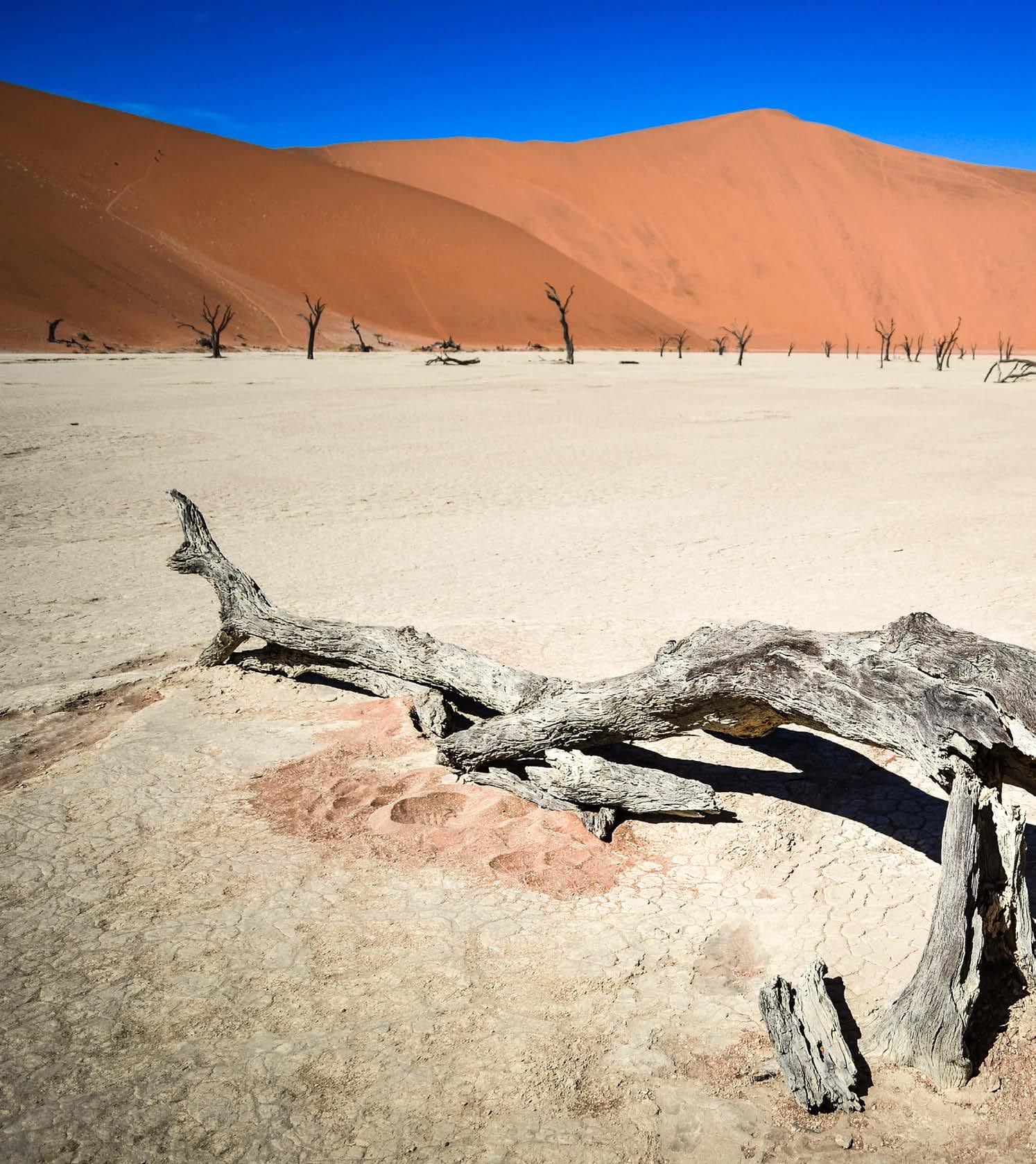 En el Namib-Naukluft Park, a sólo 55 kilómetros de alcanzar su meta ubicada en las aguas del Atlántico, muere el río Tsauchab en una zona conocida como Dead Vlei donde conviven la muerte y la belleza.