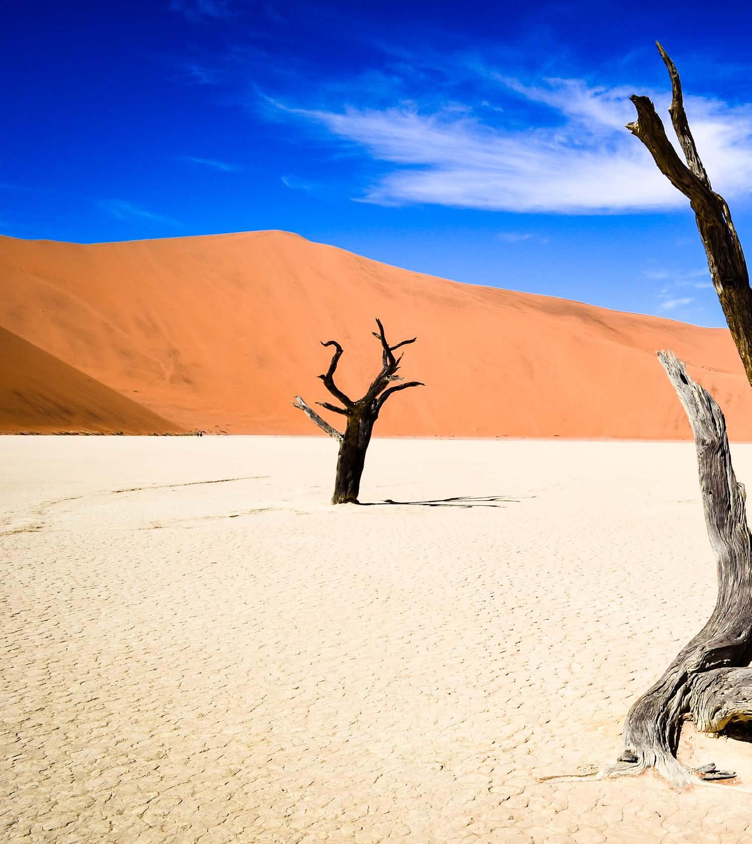 Hace unos años, este lugar de Namibia gozaba de frecuentes lluvias que llenaban de vida lagos y lagunas. Sin embargo, el agua dio paso a la desertificación que arrasó con cualquier forma de vida, entre ellas la de los estilizados árboles que allí habitaban.