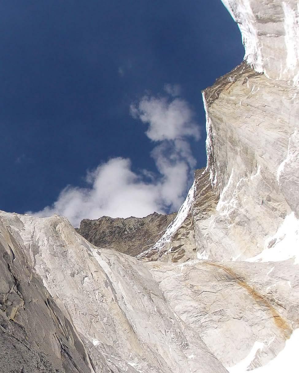 I: Fueron momentos muy tensos. Se mezcla todo. Bajábamos realmente agotados después de muchas horas de actividad sin dormir. Fue adrenalina total. Estábamos a 15 grados bajo cero. En la reunión se me caían las lágrimas mientras sudaba a chorros. Estaba empapado. Cuando saltó toda la reunión fueron instantes de un pánico brutal. No sabía ni lo que pasaba. Estaba justo en el borde asomándome. Recuerdo agarrarme con todas mis fuerzas y con la otra mano intentar meter los puntos que habían saltado. Había un clavo que estaba mal. Eneko iba con todo el material. Tuve que hacerlo con una cantimplora congelada mientras me sostenía de puntillas. No tuve más remedio que colgarme de nuevo pues estaba agotado. No sabía si eso aguantaría. Ha sido la peor situación que he vivido nunca. Pasa todo muy rápido. Casi no te das cuenta. Lo vives más cuando has conseguido bajar. Con el tiempo los momentos malos van olvidándose, afortunadamente [Risas].