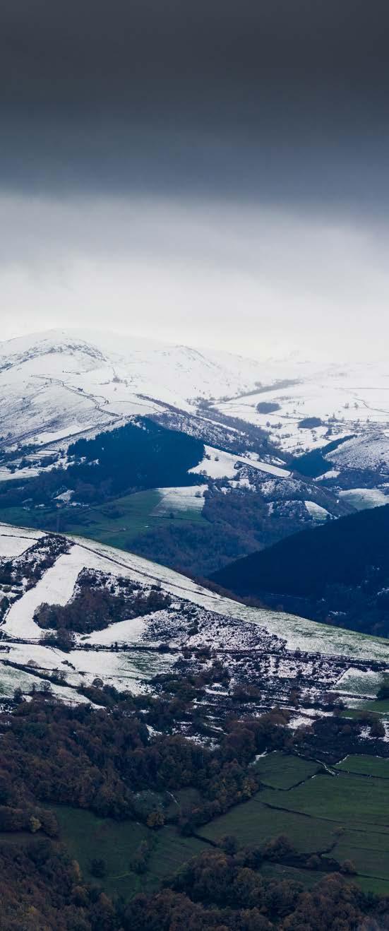 con una llovizna débil. Parece que la naturaleza va a dar una pequeña tregua para que los más atrevidos puedan disfrutar de sus paisajes, pero tampoco lo va a poner fácil. El agua, la nieve y el barro serán fieles compañeros de todos los que se atrevan a descubrir lo que hay más allá de las carreteras y de los núcleos poblados. Un paraíso entre robles, pinos, castaños y abedules. Bosques llenos de leyendas y trabajo duro. Por encima del límite del bosque, en los pastos de altura, los matorrales desaparecen bajo la nieve recordando que la vida es un ciclo. Se está acercando el crudo invierno, momen-