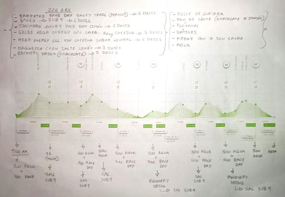 antes de que en Courmayeur se diera la salida de la CCC, recibimos la estrategia nutricional que la corredora canaria Yasmina Castro ha preparado junto a su nutricionista, David Rodríguez. Tanto ellos como la mayoría de los que realizamos carreras de ultra distancia somos conscientes de la importancia de este aspecto en una carrera de 100 kilómetros con más de 6.150 metros de desnivel positivo.