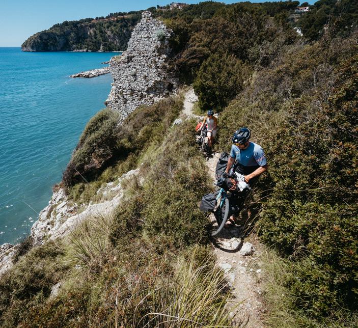 Para llegar a La Severina, nuestro quinto y último destino, tenemos por delante un trayecto de unos 160 kilómetros con algunas pendientes superiores al 20% que tendremos que superar en bicicleta. Allí, Gabriele, un escalador local nos guiará y mostrará las mejores rutas. Nos citamos con él en una cafetería donde nos dice que ha llegado allí en tren, a una estación situada a sólo un kilómetro y medio del inicio de nuestra caminata. No nos lo podemos creer. ¿Un pueblo de sólo 100 habitantes en un lugar remoto de Italia al que llegan trenes directos desde Nápoles? ¿Hemos recorrido todos estos kilómetros en bicicleta cuando podíamos haber cogido un cómodo tren? Simon se ríe y me recuerda lo bella que ha sido la ruta. Claro, 160 kilómetros son para él sólo un calentamiento.