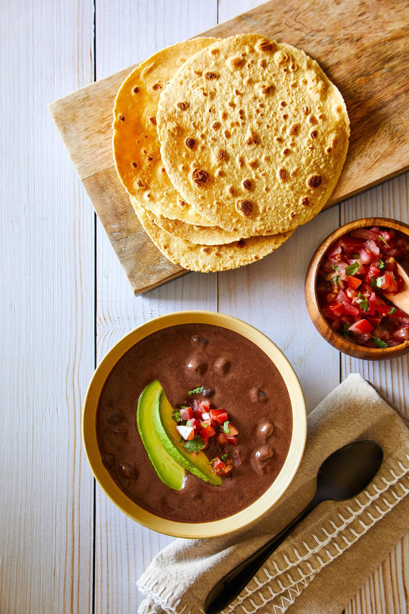 Add the remaining can of beans and stir to combine. Serve the soup with tomato salsa and sliced avocado, if you’d like
