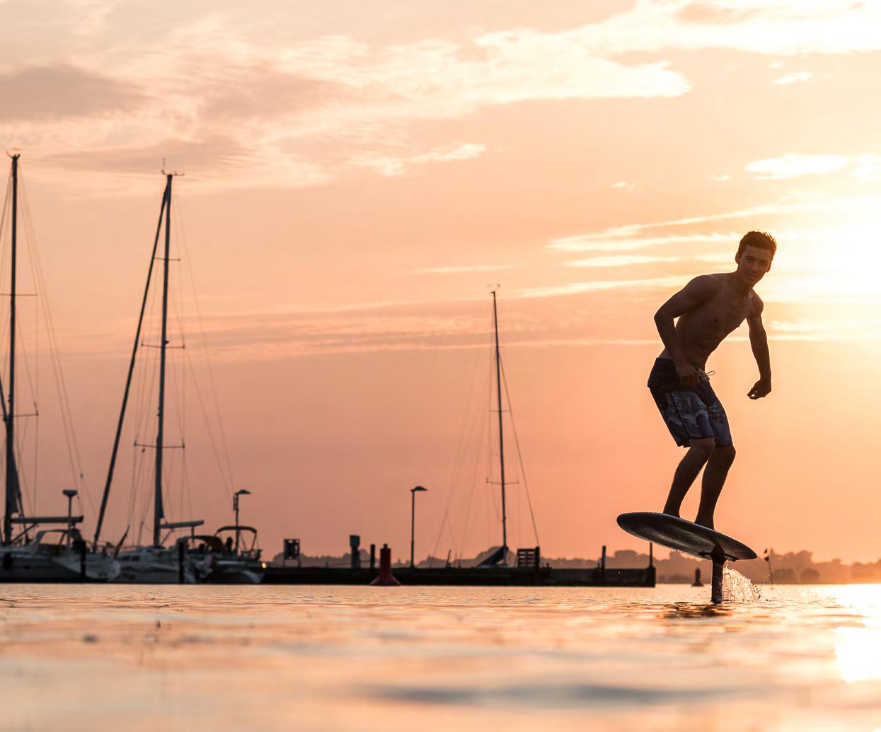 HW: Meine Leidenschaft gilt schon immer dem Kitesurfen. Alte Schule: Hoch springen, hart aufprallen und sich dann drei Tage nicht bewegen können. Zur Entspannung trifft man mich auch ab und an auf dem SUP. Ans Wingfoilen habe ich mich vor einiger Zeit mal herangetraut, aber so richtig wird das noch nichts. Da muss ich nochmal ran, wenn Zeit ist.