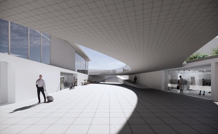 The shape of the main entrance respected the shape of the railway arch within the site as a continue of space. The entrance connects to the both the bridge level and excavate level, also include retail space on top of the tunnels.