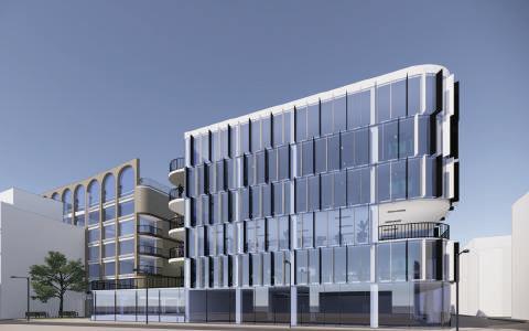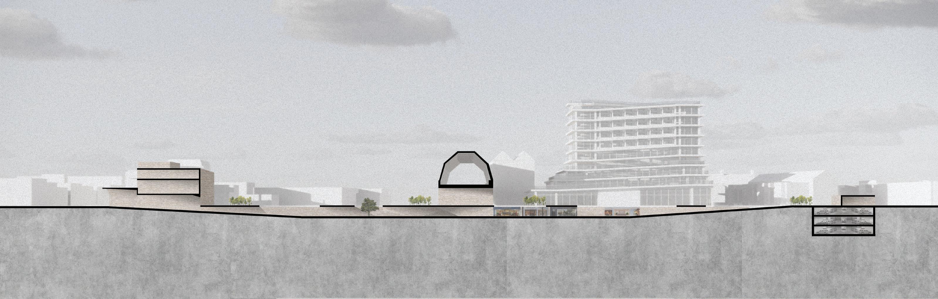 The shape of the main entrance respected the shape of the railway arch within the site as a continue of space. The entrance connects to the both the bridge level and excavate level, also include retail space on top of the tunnels.