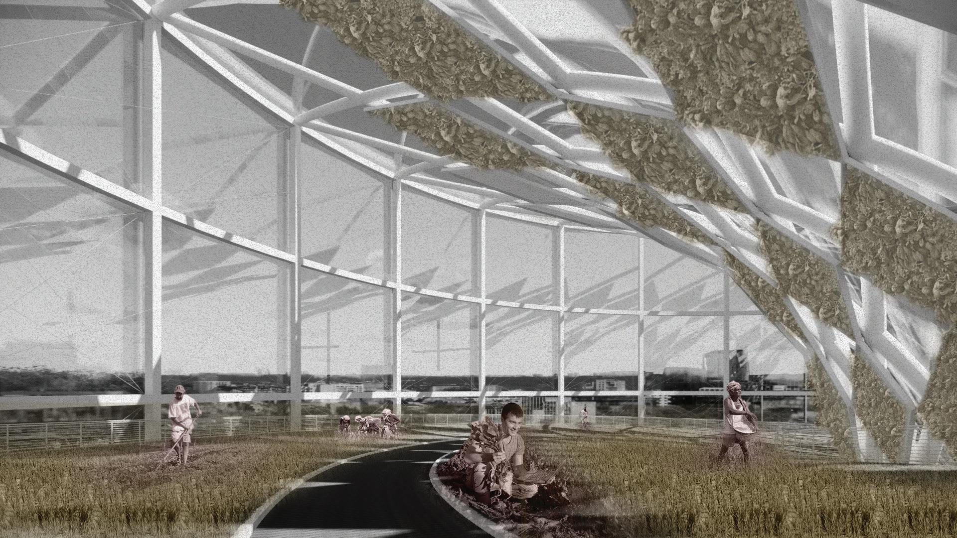 The structure is covered with glass facade whcih function as a glass house. Utilizing sunlight for farming and capture heat, porivding a warm enviornment. Rain will be collect into the water tank undergroud for watering after filtration