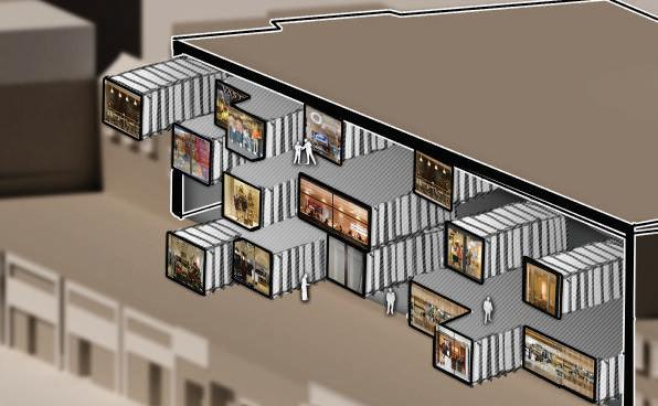 27m 48m FORM OF SPACE Entrance and retail This concept was partly derivative from some of the geometries in proximity to the site, namely the artwork elephant, a box-park like structure created through arraying a series of storage containers atop of a platform. Each of these containers serves as a creative space, retail unit or social hub. I also noticed that there was a housing estate opposite which featured a number of different dormers jutting out at different points in the facade. I have appropriated this in the design of this concept which is located in an office space above the retail block on Walworth road. Each shipping container could encapsulate a pop up store run by local creatives and entrepreneurs. The containers could be staggered to create space for people to walk on top of these platforms as well as a interesting pixelation effect to the facade of the building. The building could serve as a marketplace for ideas and people. The structure iteslf is seated within the shelled interior of the old office building. A grid of supporting beams could possibly run alongside the containers to provide structural support for the cantilevering containers. services such as lifts, fire escapes and staircases could be located to the rear of the building (east relative to the site) with a marketspace in the intermediate space between the front and the rear of the URBANstructure.INTERVENTION: SYNAPSE 8