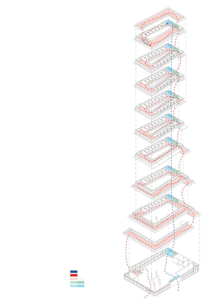 The building is divided in three sectors, hotel(blue), leisure space(green) and workspace(yellow). Part of the leisure space structure has been taken away to form an atrium, where the negative space will allow visual and physical connection between the hotel and workspace. Thus, the hotel and workspace has seperate circulation to ensure certain standard of security and privacy.