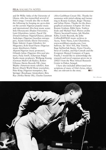 FELA: KALAKUTA NOTES and Dr Willie Anku of the University of Ghana, who has transcribed several of Fela’s songs. I would also like to thank the following for keeping me up-to-date on the current Nigerian popular music and international Afro-beat music scene: Sola Olorunyomi (Ibadan University), Lemi Ghariokwu (artist), Pascal Ott (French Embassy Nigeria/Ghana), Jahman Anikulapo (Nigerian Guardian newspaper), Austin Emielu (Ilorin University), Dapo Adeniyi (Lagos Glendora Art Magazine), Kole Israel Payne (Nigerian music distributor), Fidelis Akpom(Nigerian music promoter), Orlando Julius (Nigerian Afro-soul pioneer), Panji Anoff, (Ghanaian Pidgin Studio music producer), Wolfgang Koenig (German Multi-Cult Radio), Robert Urbanus (Sterns Records UK), Jesse Shipley (American music scholar), Stan Rijven (Dutch World Music journalist), Peter King (Nigerian trumpeter), Bas Springer (Boudisque Amsterdam), Rita Ray (Afrika Shrine UK), Charles Eassmon